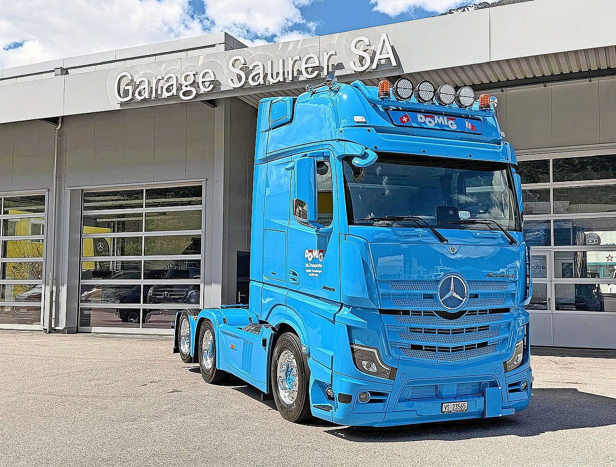 Un nouveau Mercedes-Benz Actros L 2653 LS 6×2 NLA vient renforcer le parc automobile de Domig Transporte AG à Viège (VS). C’est le premier Actros en Suisse à offrir cette configuration, surtout répandue dans les pays nordiques: un essieu traîné à double roue. Selon Domig Transporte AG, cette configuration offre une plus grande flexibilité en termes de répartition du poids dans la semi-remorque et donc aussi de domaine d’utilisation. L’empattement a été spécialement raccourci afin de conserver un rayon de braquage réduit. Le véhicule a été conçu, planifié et réalisé en détail en collaboration avec le client, explique Luca Simone du Garage Saurer SA à Viège. Outre une puissance de 530 ch pour une cylindrée de 12,8 l et la nouvelle boîte de vitesses PowerShift Advanced, cet Actros offre entre autres une cabine confortable avec des sièges en cuir et un équipement complet.