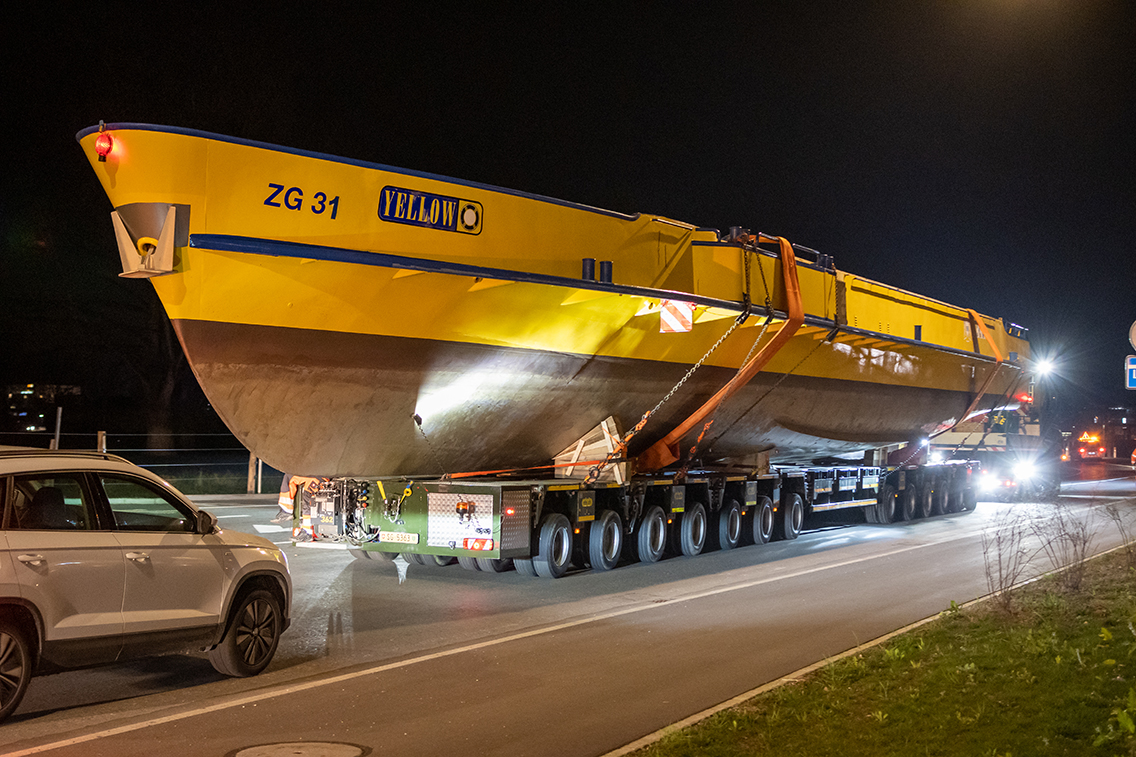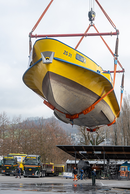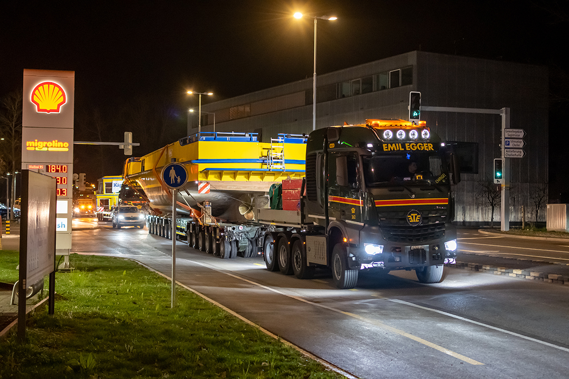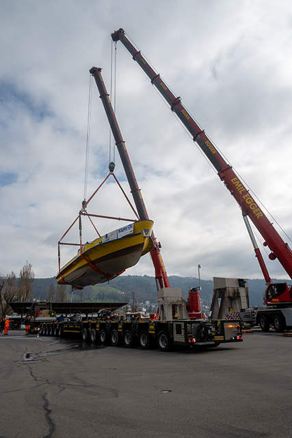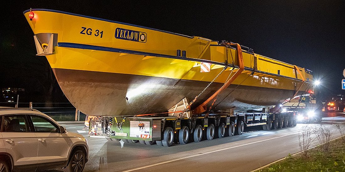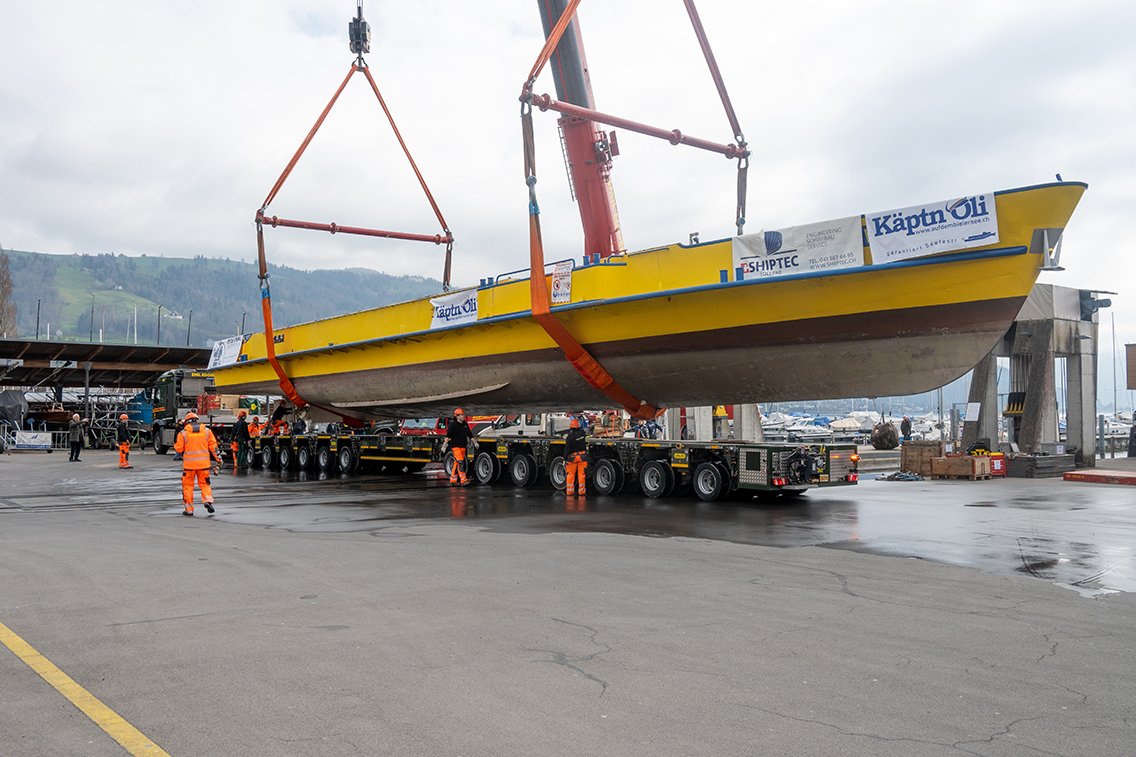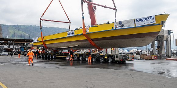 Le bateau de passagers zougois MS Yellow a trouvé une nouvelle patrie : le lac de Bienne. Le capitaine Olivier Perrot, connu sous le nom de Käptn Oli, a acquis le bateau jaune et l'exploitera bientôt sur le lac de Bienne sous le nom de MS Jolie. Mais avant cela, il doit être remonté. Pour le transport, effectué par Emil Egger AG, le bateau a été démonté. Il a d'abord été vidé de sa substance, puis la timonerie a été séparée de la coque. Le transport nocturne s'est déroulé du port de Zoug à l'autoroute, puis à Sugiez, via Berne, jusqu'au canal de la Broye. Le convoi était composé de trois camions.