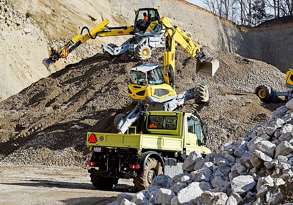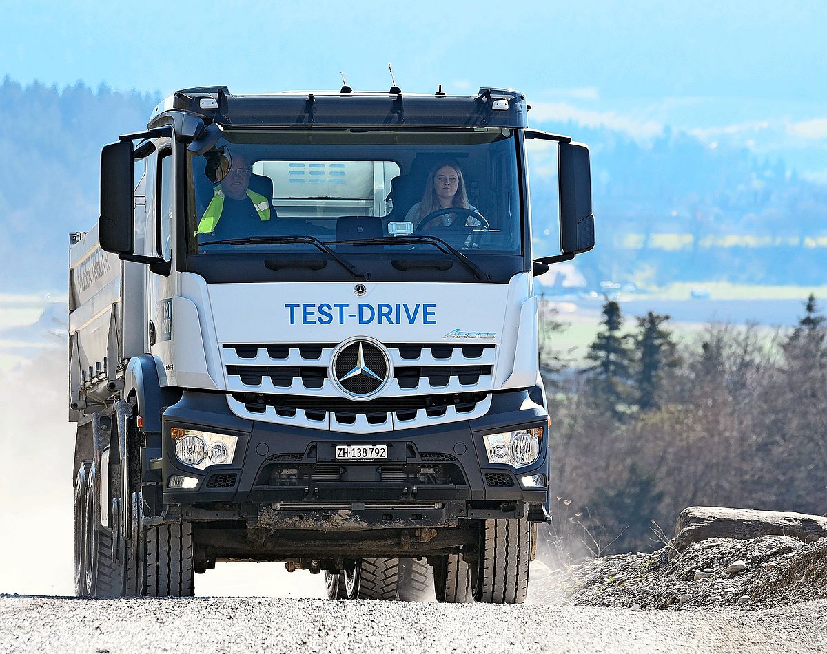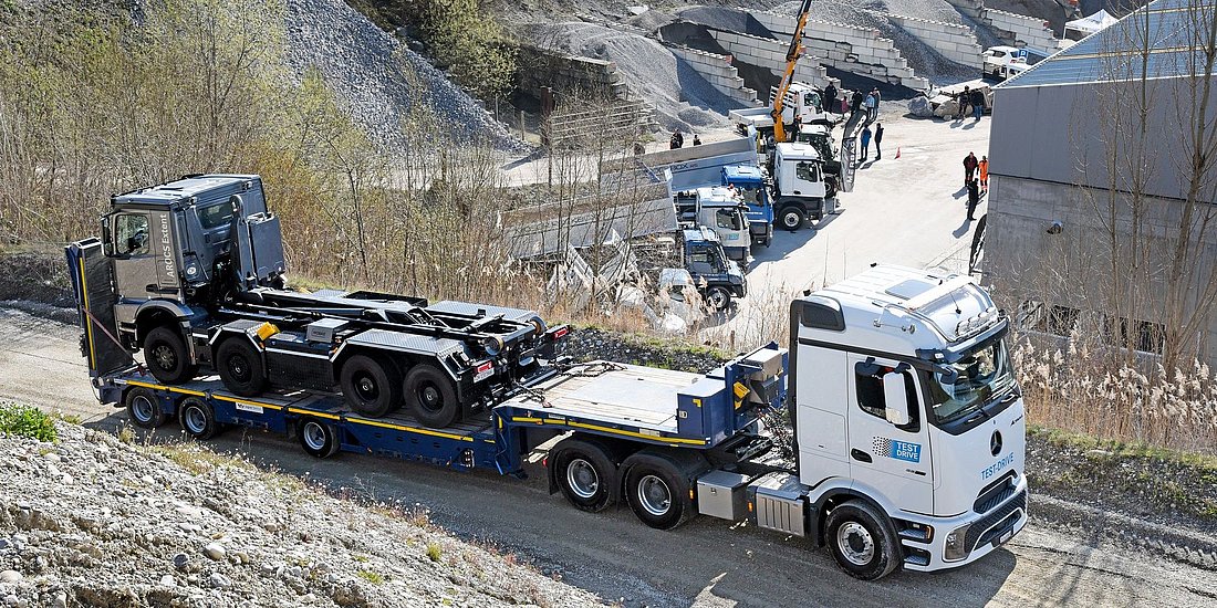Avec ses camions exposés dans la gravière, Merbag présente une sélection de solutions destinées aux maîtres d’ouvrage. L’une d’entre elles est représentée par l’embrayage turbo retarder unique en son genre, conçu pour les manœuvres à faible vitesse effectuées en pente avec des charges très lourdes, présenté sur un Arocs 8×4 équipé d’un dispositif de levage et sur un tracteur Actros L. A cela s’ajoutent la traction avant hydraulique HAD sur un train routier à benne basculante et une benne basculante 8×4 «simple». Les quatre porte-outils Unimog donnent quant à eux une idée de la grande aptitude tout-terrain.