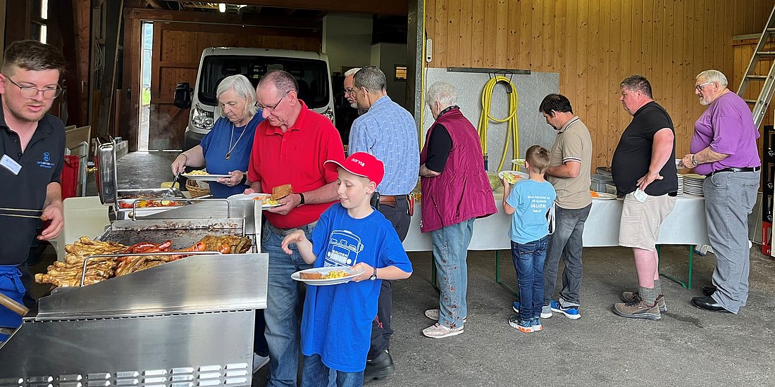 Alors que les années précédentes, il faisait plutôt chaud et que les places à l'intérieur n'étaient pas très prisées, nous étions heureux, en ce 8 juin, d'avoir un toit sur la tête, sinon notre barbecue aurait pris l'eau. Les places au sec dans la cabane du Büchli à Effingen ont donc rapidement été prises d'assaut et la joie de déguster les délicieuses grillades de notre Party Service Kuhn était à la hauteur de nos attentes qui, une fois de plus, ont été comblées. Il n'a pas été facile de choisir ce que l'on voulait déguster en premier, car les propositions étaient cette fois encore très variées. Le choix des amateurs de desserts n'a pas été plus facile, qu'il s'agisse d'opter pour un morceau de gâteau suédois, de Forêt-Noire ou de tourte aux truffes ... ou même un peu de tout. Entretemps, la pluie s'est enfin arrêtée, ce qui a permis aux participants de se regrouper à l'extérieur pour discuter des sujets les plus divers, élément important de toute sortie qui n'a certainement pas fait défaut à cette occasion. (Barbara Baldinger)