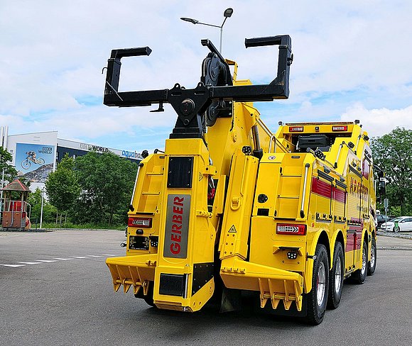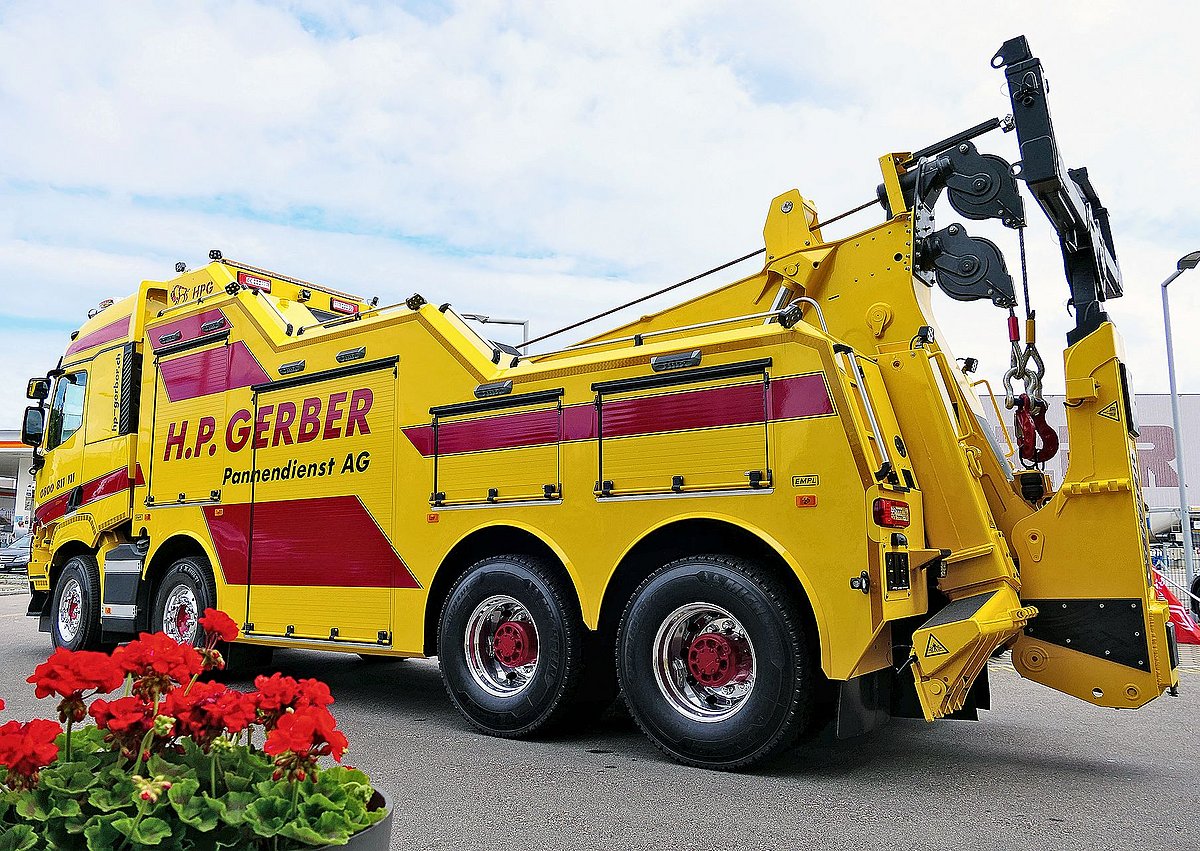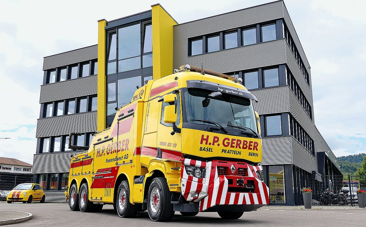Le nouveau camion de remorquage et de dépannage pour véhicules lourds de la société H.P. Gerber Pannendienst AG à Pratteln est très imposant. Le Renault Trucks K520 8×4 sera utilisé sur le site de l’entreprise à Berne.