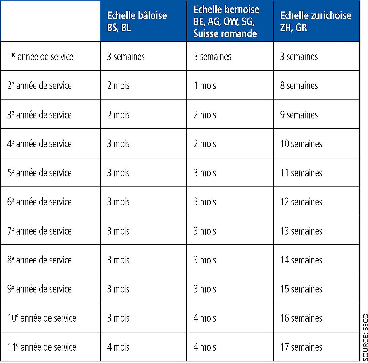 En suisse, il n’est pas obligatoire de conclure une assurance perte de gain pour cause de maladie. Si l’employeur n’a pas conclu de telle assurance, il est contraint de payer le salaire à 100 % selon la durée du contrat. Cette durée se calcule selon trois échelles en fonction des cantons. La plus utilisée est l’échelle bernoise qui sert de référence à la Suisse romande, ainsi que dans les cantons de Berne, Argovie, Obwald et Saint-Gall. Mais il y a aussi les échelles baloise et zurichoise.