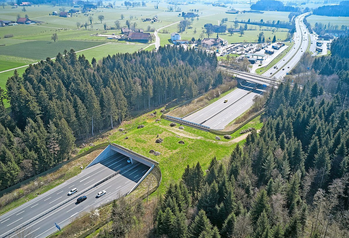 Afin de relier ces habitats morcelés, l’Office fédéral des routes (OFROU) construit des ponts et des tunnels en collaboration avec l’Office fédéral de l’environnement (OFEV) et les cantons le long des routes nationales. Ainsi, les animaux peuvent traverser les routes sans danger. Dès le début des projets de maintenance et d’extension de l’infrastructure routière nationale, l’OFROU, l’OFEV et les cantons examinent ensemble si et où de tels passages sont nécessaires, car plus de 40 des corridors faunistiques connus se trouvent directement dans le réseau des routes nationales. Associés à des clôtures de protection, ces ouvrages augmentent non seulement les chances de survie des animaux, mais aussi la sécurité des usagers de la route, car moins de passages d’animaux sauvages signifie aussi moins d’accidents.