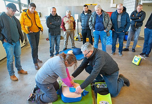 Avant qu’un défibrillateur ne soit disponible, la première chose à faire est de procéder à un massage cardiaque. La réanimation effectuée avec les mains est la plus efficace, «et de plus en plus de personnes savent le faire». Le schéma BLS-AED a pris beaucoup de place dans le catalogue des exercices à effectuer. L’abréviation «BLS» signifie «Basic Life Support» (mesures immédiates destinées à sauver la vie), et «AED» «défibrillation externe automatique». L’utilisation du défibrillateur ne remplace cependant pas le massage cardiaque manuel, ni le bouche-à-bouche. Ces deux mesures se combinent, «tout en sachant que le défibrillateur vous dit ce que vous devez faire». Pour que cela fonctionne, deux personnes doivent pratiquer la réanimation (réa). «En fait, c’est tout simple.» Enfin, s’il n’y avait pas le stress! «Essayez donc de rester calme», a conseillé Isabelle Ramseier. Les participants ont rapidement constaté à quel point le massage cardiaque à lui seul est éprouvant, puisqu’ils étaient déjà essoufflés au bout de deux minutes. Et le «patient» n’était toujours pas «réveillé». C’est alors que la responsable du cours a avoué que «sa toute première réa avait duré deux heures». Le programme du cours comprenait également différents exemples de cas pouvant survenir: comment distinguer et reconnaître l’arrêt circulatoire, l’infarctus du myocarde ainsi que l’attaque cérébrale ou la congestion cérébrale et ce que l’on peut/doit faire en pareil cas en tant que secouriste. Ce qui n’est pas toujours clair: «25 % des personnes concernées ont les mêmes symptômes, mais pas de congestion cérébrale.» Il est évident que le temps d’alerte et de sauvetage doit être le plus court possible. Sans oublier qu’il convient de «se rendre immédiatement à l’hôpital, mais exclusivement en ambulance!» L’exercice final, qui consistait à panser une blessure qui saignait abondamment, semblait donc simple, et pourtant: alors que l’auteur de ces lignes, qui, comme beaucoup, ne supporte pas la vue du sang, tripotait avec hésitation le pansement compressif, Isabelle lui a arraché le matériel des mains et l’a immédiatement enroulé autour de l’avant-bras «blessé» de la victime. «C’est comme ça que ça marche. Il faut faire vite, car le sang gicle!»