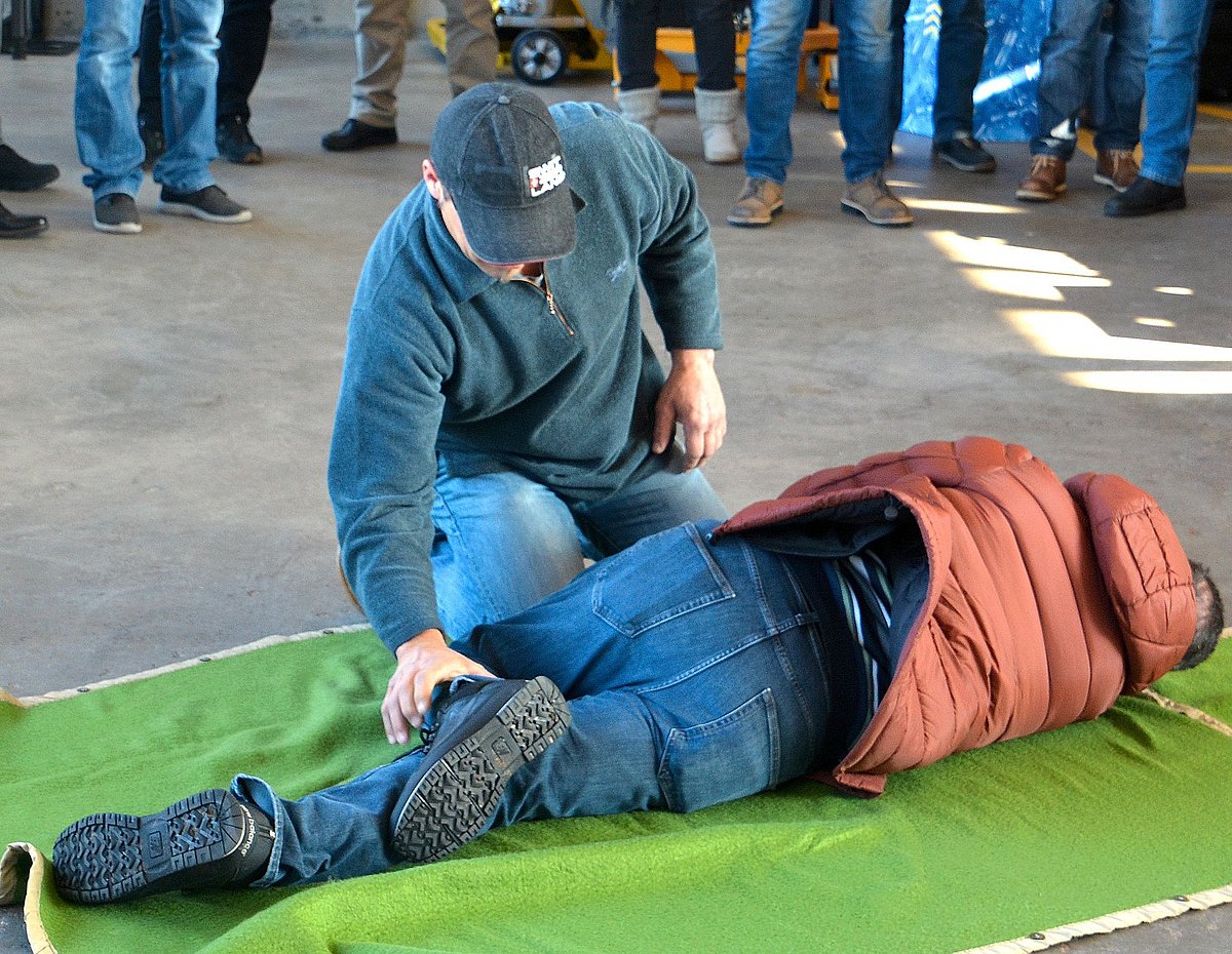 «Faites quelque chose, il y a une personne qui est au sol», a demandé la responsable de cours aux «secouristes» présents, qui se tenaient autour d’une personne apparemment inconsciente et peut-être blessée au sol. Il s’agissait de le (ou la) mettre en position latérale de sécurité. «Déterminez si cette personne respire, si elle répond, c’est-à-dire si elle vous entend. Parlez-lui, les personnes inconscientes entendent tout», dit-elle. «Tirez la tête en arrière pour dégager les voies respiratoires et enlevez les objets gênants, les lunettes ou le trousseau de clés par exemple». Bilan de cet exercice: il s’est avéré que la position latérale de sécurité n’était pas si facile à réaliser et que cela ne se fait pas sans un certain entraînement. Il faut également s’exercer à la désincarcération d’une personne prisonnière d’un véhicule accidenté. Dans ce cas, les poignées de sauvetage sont généralement utiles, mais pas pour les personnes très corpulentes ou pour celles qui se trouvent dans un camion accidenté: il faut alors plusieurs sauveteurs pour procéder à cette opération. Important: «Fouillez minutieusement le véhicule, car il pourrait y avoir d’autres personnes à l’intérieur.»