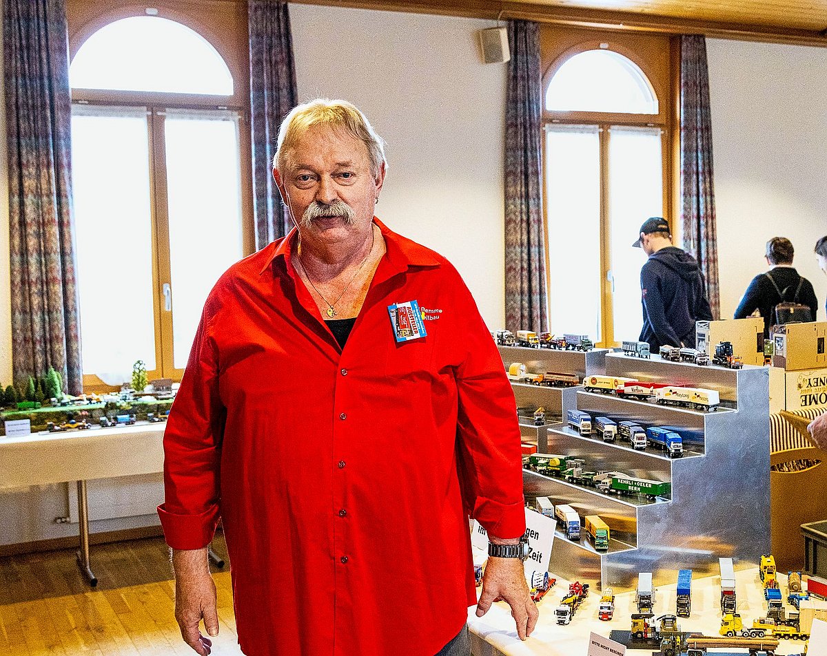 La construction de dioramas n’est pas le passe-temps favori d’Alex, ce qui explique que c’est l’un de ses amis qui construit des paysages miniatures (mais celui-ci ne construit pas de véhicules): les deux se complètent donc parfaitement! En outre, divers modèles issus de ces 55 années de construction de modèles réduits étaient disposés sur des escaliers à l’entrée. Il y avait aussi le tout premier modèle, datant de 1970: une Land Rover des pompiers de Berne. L’une des dernières créations représente un transport de transformateurs: c’est celui qui a été acheminé dans la caverne de Bitsch (VS) en décembre de l’année dernière (voir le numéro 02/2025 du magazine «Routiers»). Une autre échelle de modèles réduits très appréciée est l’échelle 1:50; des modèles à cette échelle étaient donc également exposés, mais ils étaient l’œuvre d’autres passionnés. Certains modélistes ont changé d’échelle au fil des ans, ce qui a été documenté par des photos. Les modèles les plus récents ont donc été exposés à l’échelle utilisée actuellement. Des modèles à l’échelle 1:50 et 1:24 étaient également exposés sur la scène de la salle de ce restaurant. Et l’on n’a pas oublié de tout reproduire, y compris le chauffeur: ceux qui le connaissent le reconnaîtront même en regardant attentivement à travers le pare-brise! Cette exposition a attiré de nombreux visiteurs pendant les deux jours, ce qui a permis aux exposants (et au restaurateur) de se réjouir de l’intérêt constant du public pour le modélisme.
