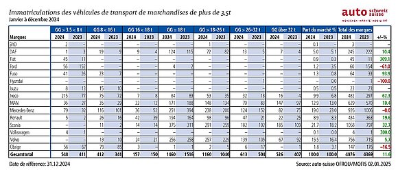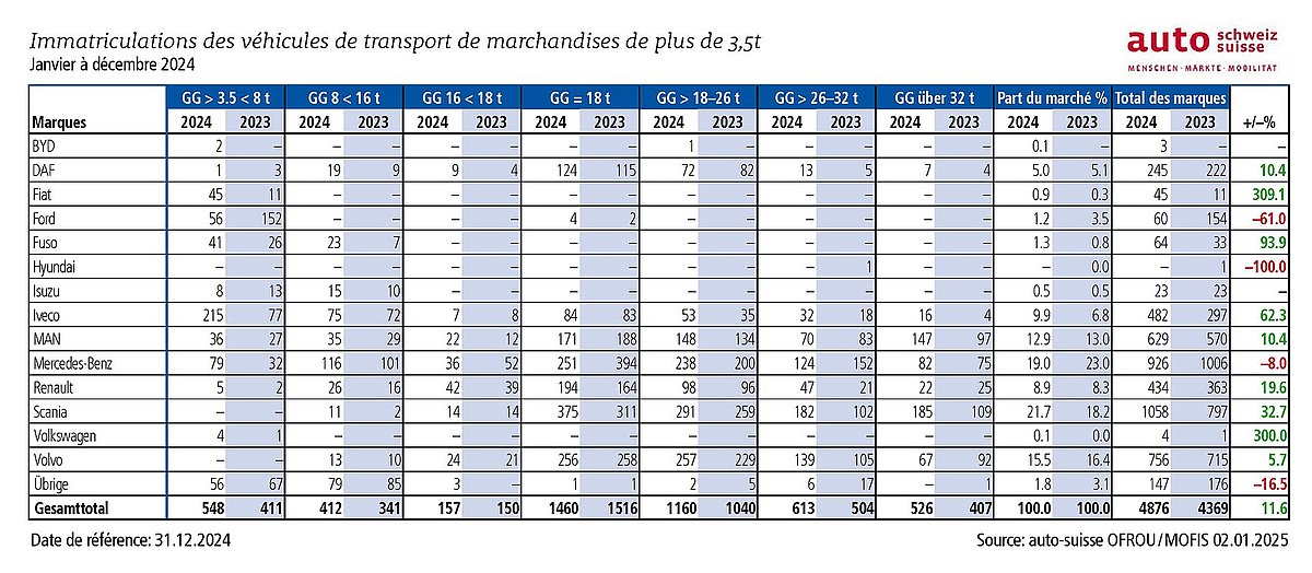Le groupe d’experts de la Confédération pour les prévisions conjoncturelles a de nouveau revu à la baisse ses perspectives de croissance pour 2024. Le produit intérieur brut (PIB), corrigé des effets spéciaux tels que les manifestations sportives, n’a probablement augmenté que de 0,9 % l’année dernière. Pour 2025, on s’attend à une hausse de 1,5 %. Malgré les perspectives économiques mitigées, le marché des véhicules utilitaires en Suisse reste stable, comme le communique auto-suisse. C’est surtout dans le segment des véhicules utilitaires lourds de plus de 3,5 tonnes que l’on a enregistré une nette croissance en 2024. En effet, le nombre de nouvelles immatriculations a augmenté de 11,6 % pour atteindre 4876 véhicules, contre 4369 l’année précédente.