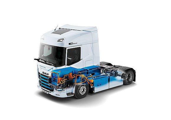 Bien que la chaîne cinématique électrique pèse environ 1100 kg de moins que celle d’un diesel, le camion électrique pèse toujours plus lourd qu’un modèle diesel comparable en raison du poids des batteries (850 kg chacune). Avec plus de trois batteries, un camion électrique DAF perd en charge utile, même avec la compensation légalement possible (pouvant aller jusqu’à deux tonnes). Le module E-Drive comprend également le chargeur embarqué CA (22 kW), proposé en option sur les modèles XD et XF. Les camions électriques lourds sont équipés de série d’un système de recharge rapide de 150 kW, mais peuvent également être équipés en option d’une puissance de recharge de 325 kW.