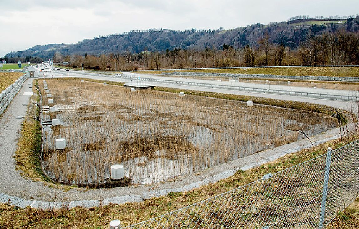 Lorsqu’il n’est pas possible d’évacuer l’eau par le talus et qu’elle est collectée, l’OFROU met en place des SABA. Ces installations filtrent les eaux usées des routes avant qu’elles ne rejoignent les cours d’eau ou le sol. Selon la topographie, les SABA naturels peuvent couvrir jusqu’à dix kilomètres d’autoroute en retenant au moins 80 % des polluants.