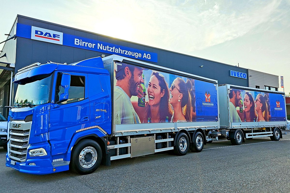 Récemment, la flotte a été agrandie avec un nouveau camion remorque DAF XF 530 FAN, équipé d’une bâche coulissante sur mesure avec hayon élévateur et système de chargement traversant vers la remorque. C’est une combinaison qui permet un chargement et un déchargement efficaces, en particulier pour la livraison de boissons, et répond aux exigences élevées de l’utilisation quotidienne. MH Trans apprécie la bonne collaboration avec Birrer Nutzfahrzeuge AG, son fournisseur de véhicules. «Je suis ravi d’avoir déjà un deuxième DAF dans ma flotte. Surtout parce que je sais qu’en cas de problème, un garage compétent avec de bons mécaniciens est à ma disposition et me permet de reprendre rapidement la route», explique Fredu Hehlen.