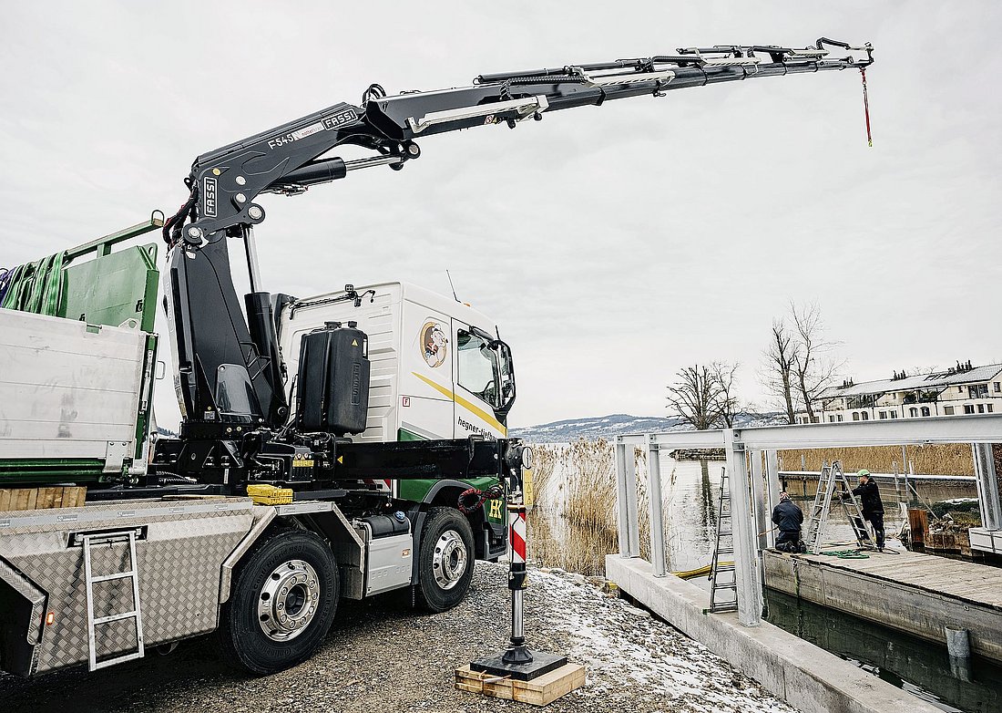 La grue est une Fassi F545RA.2.28. Sa hauteur maximale sous crochet est de 27 mètres, sa portée maximale (à 1200 kg) de 23 mètres et sa charge de levage est de 15 tonnes. Le véhicule a un poids à vide de 26 tonnes et un poids total de 40 tonnes, ce qui donne une charge utile de 14 tonnes. La longueur du pont de 6,30 mètres permet de transporter des charges jusqu’à 7,70 mètres, ceci avec une hauteur de chargement maximale de 2,40 mètres. Comme l’a déjà mentionné Marcel Hegner, ce nouveau véhicule a bien d’autres atouts que sa puissante grue et son pont robuste. Grâce à l’attelage de remorque, il peut en effet tracter une remorque d’une charge utile de 14 tonnes. Des grappins à pierres, des grappins à coquilles (500 litres), des bennes pliantes, une installation d’aspiration du verre (max. 900 kg), des bennes à béton (400 litres / 800 litres), une flèche réglable, une benne roulante (11 m³), diverses pinces à pierres, une fourche à palette et un silo thermique font également partie des équipements supplémentaires pouvant être utilisés avec ce véhicule équipé d’une grue. Cette acquisition constitue un investissement dans la flexibilité et donc dans l’avenir de l’entreprise, qui a déjà 60 ans «au compteur». L’entreprise Konrad Hegner SA a donc le même âge que la société Notterkran SA, qui a installé la grue: cette entreprise argovienne a en effet fêté son 60e anniversaire l’année dernière.