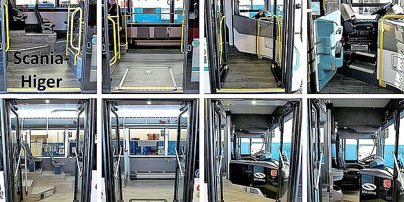 Une attention particulière est accordée aux aspects qui concernent les chauffeurs, à savoir le comportement au volant, la vue d’ensemble du trafic et l’utilisation du poste de conduite. L’aménagement du poste de travail comprend également l’accès, dont les différentes approches sont illustrées sur la photo ci-dessous. Le comportement routier concerne le fonctionnement fiable des systèmes d’assistance, mais aussi le comportement de la direction et la réactivité de la motorisation, qui définissent le comportement routier dans les virages serrés ou au démarrage. L’accès à l’habitacle et au siège conducteur varie selon les véhicules. Les différences sont clairement visibles sur la photo ci-dessous. L’espace plat et accessible aux fauteuils roulants et aux poussettes est bien conçu dans tous les bus; seul l’Iveco offre peu d’espace pour manœuvrer avec une poussette. Cependant, c’est le seul participant à entrée basse qui ajoute à l’espace plat à l’avant d’une plate-forme surélevée à l’arrière.