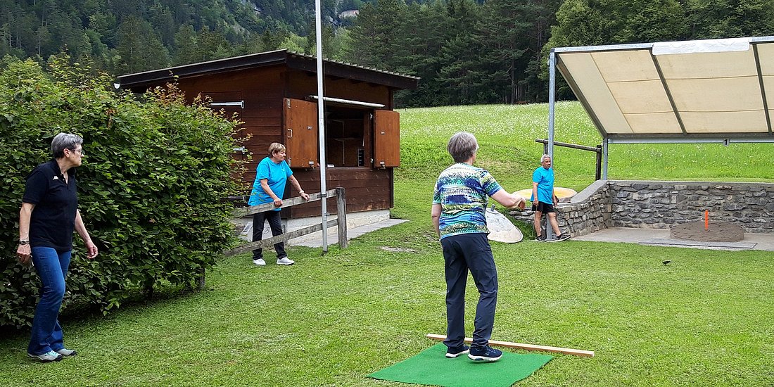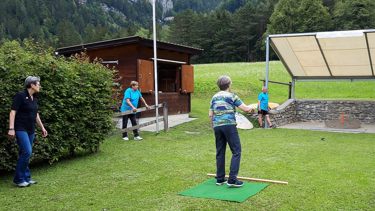 Ce jour-là, le temps de plus en plus maussade n’a pas empêché 18 membres des Routiers Suisses motivés et de bonne humeur de se rendre au Platzgerclub de Schwanden bei Brienz. Nous avons d'abord été initiés au Platzgen (sorte de jeu de palets) et ensuite, nous avons pu commencer à jouer! Toucher le «Ries» (but) n'était pas si simple: le «Platzg», dont le poids est compris entre 1 et 3,5 kg, doit être lancé avec la technique adéquate de manière à atteindre le «Ries», une cible en terre glaise d’un diamètre de 1,40 mètre, située à 17 mètres du lanceur. Malgré le fait d'être trop loin, trop court, trop près, plus à gauche, plus à droite, la plupart des participants ont fini par s’améliorer au fil des parties. Certains ont même réussi à faire une passe (5 coups décomptés) et à atteindre le «Ries»! Pour finir, nous avons été gâtés par le Platzgerclub, qui nous avait préparé un repas composé de steaks, de salades, de chäsbrätel (tranche de pain sur laquelle on fait fondre du fromage à raclette) et d'un délicieux cake. Nous avons beaucoup ri et bien discuté, et pas seulement du Platzgen! Une fois de plus, un après-midi amusant et vraiment réussi s'est terminé bien trop vite. Nous remercions l'équipe du Platzgerclub, le «maître-grilleur» et toutes les personnes qui étaient présentes pour ce super après-midi. Une chose est sûre: nous reviendrons! (Iwan Weyermann)