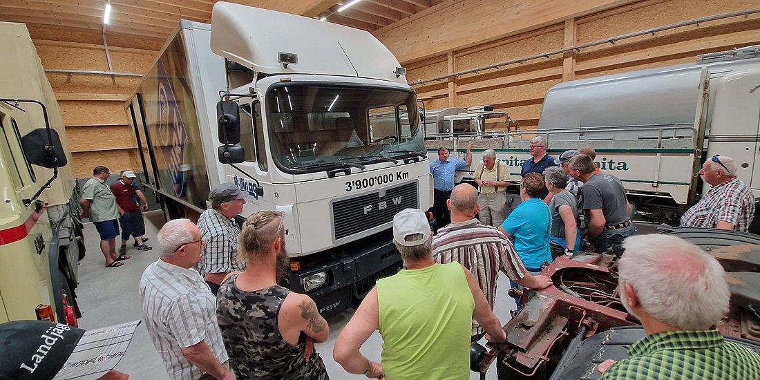 Après le déjeuner, 22 membres se sont retrouvés au garage Kiener à Seewen et sont montés dans le car de la compagnie Uristier Reisen. Celui-ci nous a conduits à Näfels, dans les halls de Willi Röllin. Nous avons bénéficié d'une visite guidée par Willi en personne et avons pu admirer près de 80 ans d'histoire du transport à Wetzikon. Tous les véhicules sont des propriétés privées et, à l'exception de 2 ou 3 exemplaires, ils sont encore en état de marche.