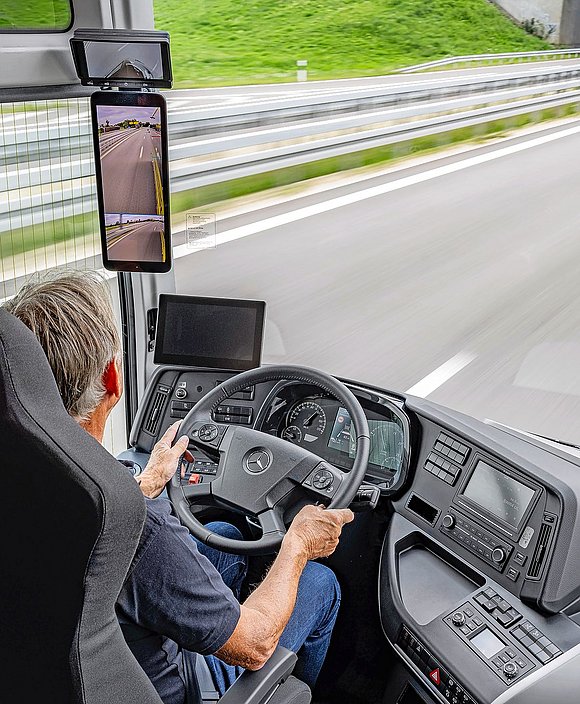 La plupart des systèmes de sécurité nouvellement prescrits par la GSR-B doivent aider le chauffeur ou la chauffeuse à faire face à la complexité de la circulation urbaine. Il est notamment prescrit de disposer d’un assistant de changement de direction qui avertit de la présence de piétons ou de cyclistes du côté de la portière. Mercedes-Benz utilise son Sideguard Assist depuis sept ans déjà, mais l’a maintenant affiné et étendu au côté conducteur, de sorte que l’on est averti au volant de la présence de personnes dans le secteur critique de l’autobus lors d’un changement de direction des deux côtés. Outre l’assistant de freinage d’urgence encore plus performant, qui détecte les personnes en mouvement ou à l’arrêt ainsi que les cyclistes et qui fonctionne sur toute la plage de vitesse, un système de surveillance frontale supplémentaire vient s’ajouter: Front Guard Assist détecte les obstacles et les personnes devant le véhicule. Mercedes propose désormais des caméras à la place des rétroviseurs extérieurs traditionnels. Mercedes-Benz a certes été le premier constructeur à lancer la MirrorCam sur l’Actros il y a sept ans déjà, mais il a fallu attendre jusqu’à présent pour qu’elle soit disponible dans le secteur des bus. Et elle reste pour l’instant une option. D’un point de vue aérodynamique, tout parle en faveur de l’utilisation de caméras et la vue sur le trafic est encore une fois nettement meilleure. En combinaison avec les caméras supplémentaires qui permettent d’obtenir une vue panoramique parfaite à 360 degrés (vue d’oiseau), les manœuvres en ville ou dans les points chauds touristiques sont simplifiées et plus sûres, sans parler des informations supplémentaires des lignes d’assistance spécifiques au véhicule qui facilitent le retour sur sa voie après un dépassement.