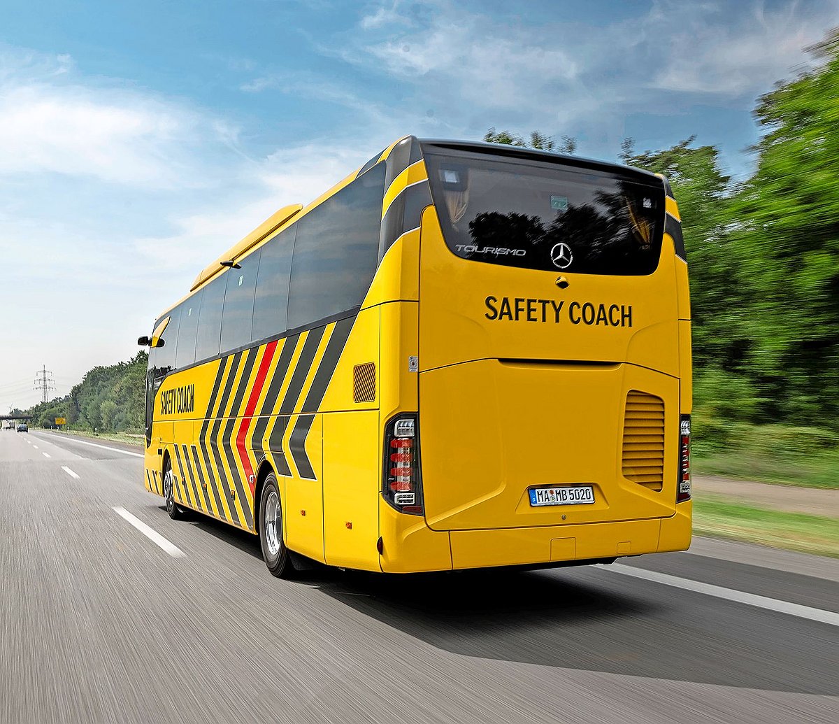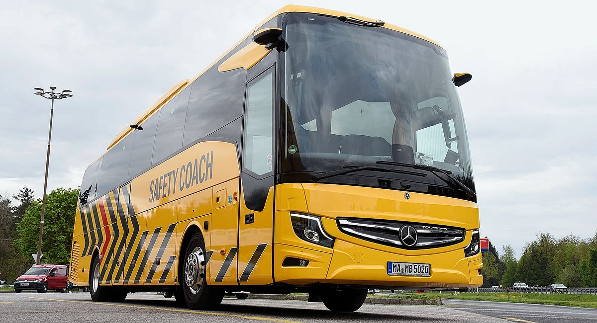 Outre les luxueux autocars de tourisme Setra, la division autobus de Mercedes-Benz propose une ligne d’autocars haut de gamme sous son propre nom, le Tourismo, qui complète la gamme des autocars interurbains Citaro Ü et Intouro et des autobus urbains Citaro et CapaCity. Le Tourismo a été entièrement revalorisé l’année dernière et équipé des systèmes de sécurité les plus récents de Mercedes. Tout l’équipement de sécurité disponible a été intégré dans un Tourismo spécial afin de rapprocher la technique des clients et de sensibiliser la population. Mercedes-Benz l’a baptisé Safety Coach (autocar de sécurité) et l’a peint en jaune, avec des couleurs contrastées très visibles. Le Safety Coach n’est pas une idée nouvelle, car Mercedes-Benz avait déjà présenté un premier Safety Coach il y a vingt ans (voir encadré en page 14), basé à l’époque sur l’autocar Travego. L’autocar actuel est la sixième version du Safety Coach.