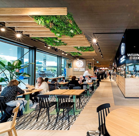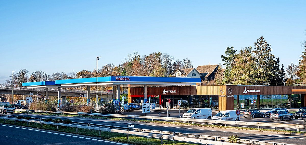 «Bien située sur la rive gauche du lac de Zurich, cette aire de repos est accessible à 60 000 véhicules par jour», explique la société Tamoil SA en parlant de l’aire de repos Herrlisberg Nord, qui a été ouverte l’année dernière. Pour la première fois, Tamoil coopère avec l’entreprise Avolta SA pour mettre en place un concept moderne de restauration, de commerce de proximité et d’approvisionnement en carburant, en mettant l’accent sur les produits locaux. Le Granbar sert du café italien Kimbo et des pâtisseries, tandis que la maison Holy Cow! propose des hamburgers fraîchement préparés à partir d’ingrédients suisses.