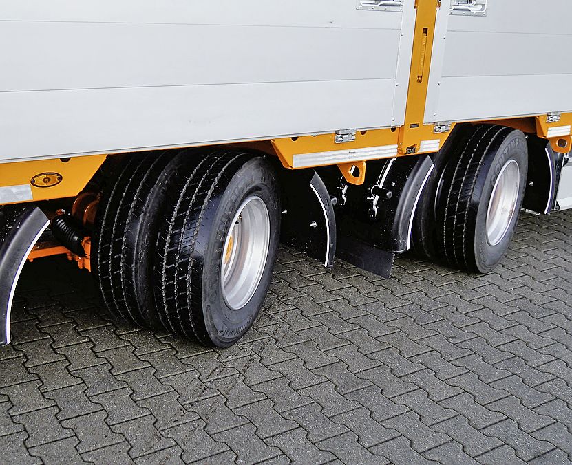 La semi-remorque est équipée d’essieux à freins à tambour et de pneus jumelés. Les deux essieux sont à direction forcée hydraulique, ce qui facilite les manœuvres sur les chantiers étroits. Un système de détection de la charge par essieu via le Canbus EBS donne au conducteur des informations sur le poids de la remorque ainsi que des messages de diagnostic et de système.