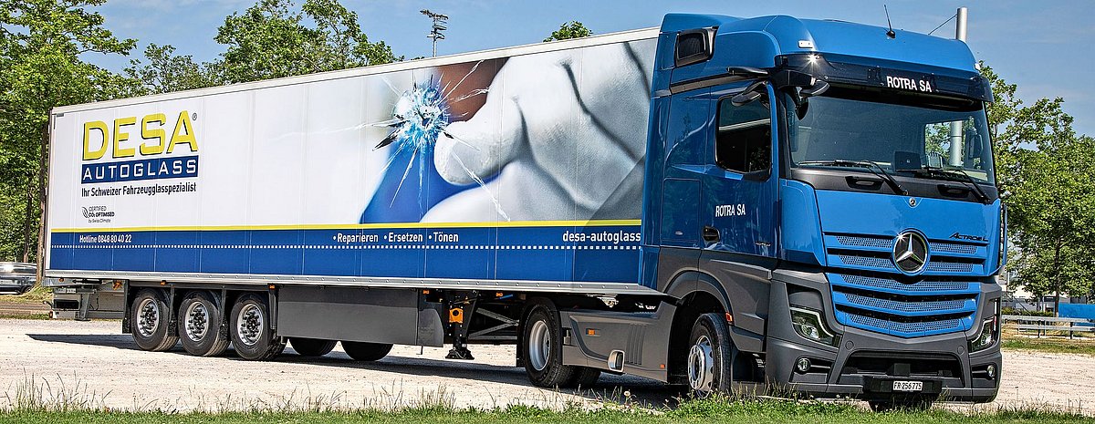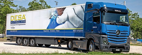 Les trois camions les plus récents de la flotte de Rotra SA, trois Mercedes-Benz Actros L 1845 LS 4×2, sont également équipés de superstructures frigorifiques. Les semi-remorques arborent toutefois sur toute leur surface une publicité DESA Autoglass. Michele Silvestre, responsable marketing et vente chez DESA Autoglass SA, assure que les vitres de voiture ne doivent évidemment pas être transportées sous réfrigération: «Nous utilisons ces trois camions comme surfaces publicitaires, dit-il, ce sont de très bons supports publicitaires. Ainsi, lorsqu’ils roulent pour la maison Rotra SA, ces semi-remorques font aussi de la publicité pour nous.»