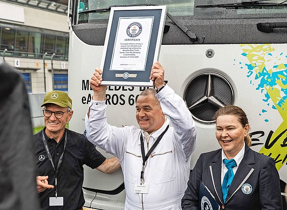Sur le circuit d’Oschersleben, toutes les mesures ont été prises pour garantir la sécurité de cette course record, mais avec ses 14 virages serrés, le circuit exigeait une concentration au volant maximale de la part de Marco Hellgrewe, qui a roulé pendant six heures et 22 minutes à une vitesse moyenne d’environ 20 km/h avant de franchir la ligne d’arrivée, après avoir parcouru exactement 124,7 km. Le précédent record de conduite en marche arrière était de 89 km et avait été établi en 2020 aux Etats-Unis. Après avoir battu ce record, Marco Hellgrewe a encore parcouru 30 km sur routes ouvertes jusqu’à Halberstadt, sous escorte policière. «Je suis extrêmement fier d’avoir ramené ce record en Allemagne avec Mercedes-Benz Trucks, et ce pour la première fois au monde avec un véhicule entièrement électrique», a déclaré Marco Hellgrewe après avoir accompli son exploit. Cela envoie un signal fort pour l’avenir des motorisations alternatives. «Je suis convaincu que nous avons également réussi à attirer l’attention sur les questions de sécurité routière et d’image des chauffeurs, qui me tiennent particulièrement à cœur en tant qu’examinateur aux examens de jeunes élèves conducteurs de camions.»