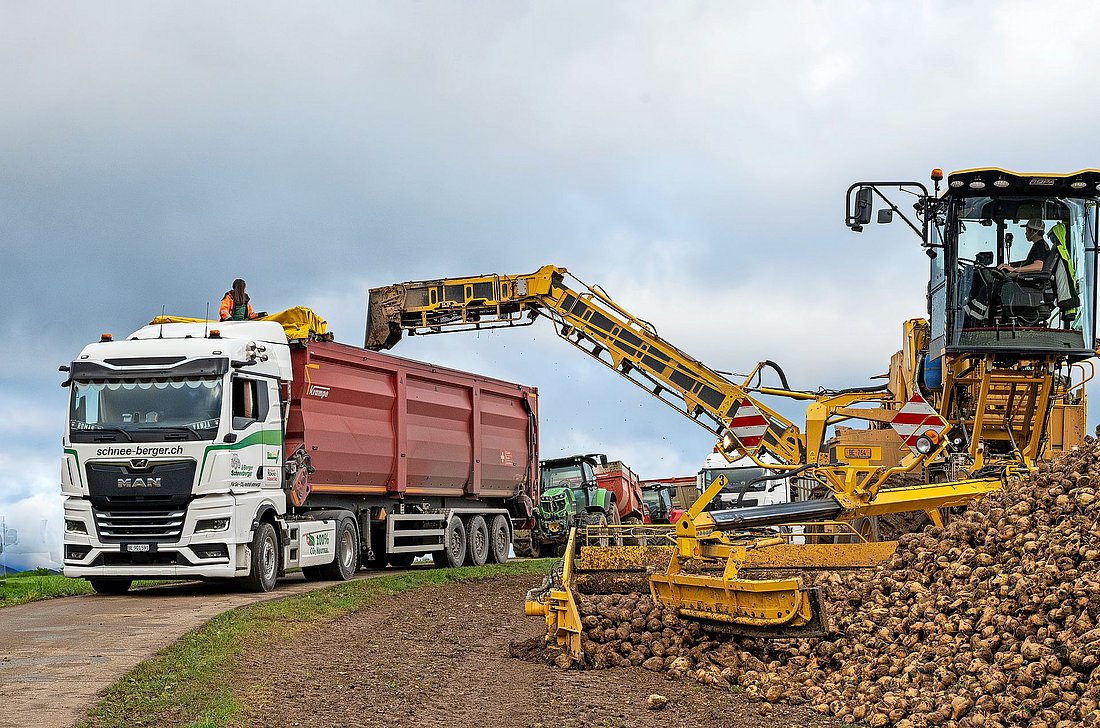 En cette saison des betteraves sucrières, d’innombrables attelages chargés de betteraves sont donc en route, que ce soit du champ à la gare la plus proche ou directement jusque dans les installations des sucreries d’Aarberg ou de Frauenfeld. Vanja von Allmen est assise dans l’un de ces véhicules. Elle travaille comme chauffeuse pour l’entreprise agricole Schneeberger & Berger Agrar-Service à Oberbottigen (BE). Une semi-remorque à fond mouvant est attelée à son tracteur MAN TGX, ce qui représente un attelage idéal pour ce genre de tâche.
