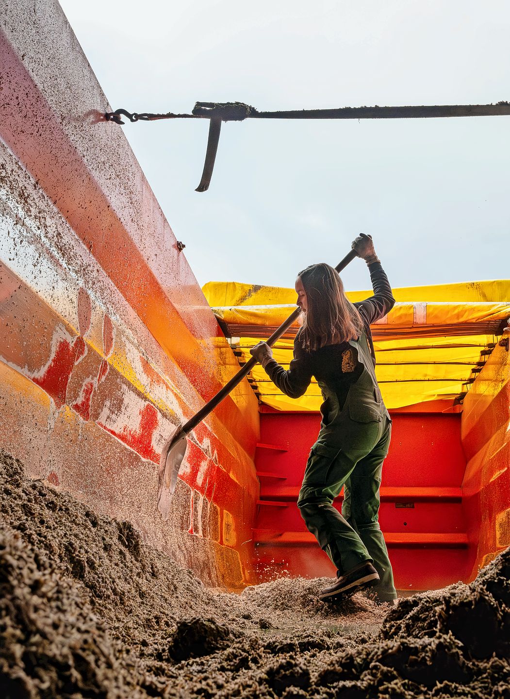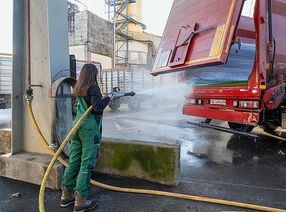 Alors qu’elle est encore à la ferme de Pleigne, elle reçoit un message lui indiquant l’emplacement d’un champ, situé non loin de là, où elle doit aller charger des betteraves sucrières. Elle s’y rend en empruntant de petits chemins bétonnés, pas plus larges qu’un chemin de terre. Bientôt, c’est toute une file de tracteurs et de camions qui attendent d’être chargés par la «souris». Vanja grimpe sur le bord de la semi-remorque, derrière la cabine, pour surveiller le chargement. Puis elle referme la bâche et repart, cette fois en direction d’Aarberg, à la sucrerie. Là, elle se rend sur la balance et s’arrête brièvement dans une zone où un bras préhenseur prélève un échantillon de son chargement. Quelques mètres plus loin, elle fait tomber les betteraves sucrières hors de sa semi-remorque. La cargaison du champ laisse évidemment des traces dans la semi-remorque. C’est pourquoi Vanja la lave soigneusement: «Tout à l’heure, nous chargerons à nouveau des copeaux de betteraves, c’est-à-dire de la nourriture pour animaux», dit-elle. «Après tout, nous n’aimerions pas non plus que notre nourriture soit souillée.»