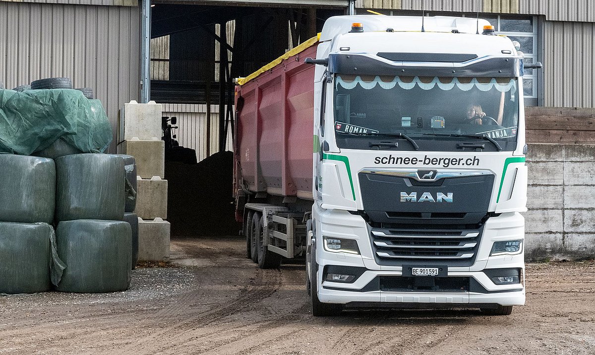 Une journée de travail typique de la fin de l’automne commence tôt pour Vanja von Allmen. Le départ a lieu à cinq ou six heures du matin, selon que sa semi-remorque a été préalablement chargée ou pas. Le jour de notre reportage, la semi-remorque était déjà chargée. Notre première destination est Pleigne, dans le canton du Jura, loin derrière Delémont, près de la frontière française, à environ 800 mètres d’altitude. «Nous avons chargé des copeaux de betteraves», déclare-t-elle. «Ceux-ci sont issus de la production de sucre à partir de betteraves sucrières et constituent un aliment apprécié des animaux.» Notre première destination est donc une ferme. Même si Vanja von Allmen ne transporte pas de betteraves entières, il s’agit ce jour-là d’un produit issu de cette culture agricole, qui, comme chacun sait, appartient à la famille des amaranthacées.