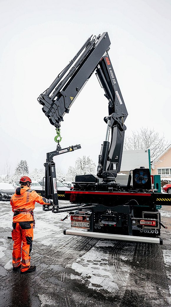 Quoi qu’il en soit, ce nouveau camion-grue fait ses preuves. Cela est dû d’une part à la technologie sophistiquée du Volvo FH Aero Electric, en sachant que d’autre part, la superstructure doit être bien adaptée au véhicule. «Avec la maison Notterkran, nous pouvons compter sur un partenaire de premier ordre», affirme Marius Egger. «Bien que nos souhaits n’aient pas été faciles à mettre en œuvre, ils ont été réalisés de manière optimale.» Il cite par exemple la création d’une surface de stationnement prévue pour la fourche de grue, qui est montée à l’arrière afin que celle-ci n’empiète pas sur la surface de chargement. «J’ai pu discuter personnellement avec le chef de projet responsable lors de la réception du gros œuvre, clarifier les détails et apporter des ajustements encore plus détaillés à l’ensemble de la structure», nous explique-t-il. «Et nous sommes très satisfaits du résultat!»