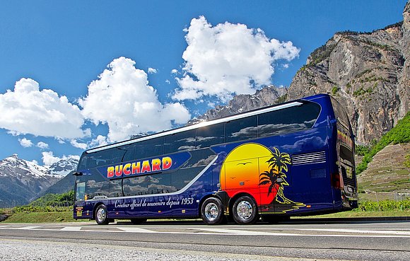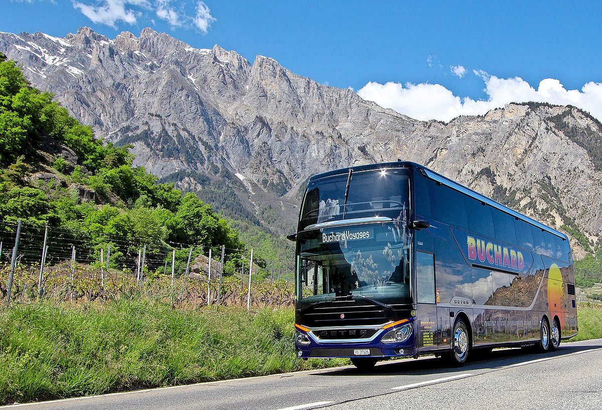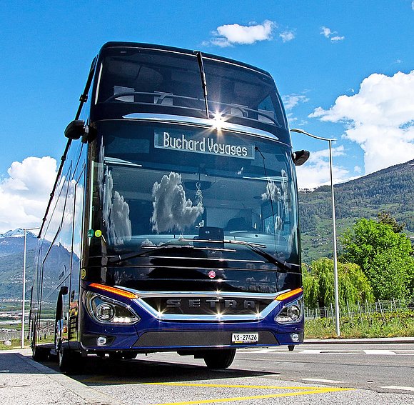 Avec ce nouveau Setra S 531 DT, la société de transport suisse Buchard, basée à Leytron, mise sur un autocar à la fois innovant, sûr et confortable. Ce véhicule à deux étages ne se distingue pas seulement par son design élégant, il dispose également d’un très bon équipement. Il est le premier autocar de Daimler Buses en Suisse à être équipé du système numérique MirrorCam, qui remplace les rétroviseurs extérieurs traditionnels par des modules de caméra compacts et de grands écrans intérieurs. Résultat: une meilleure aérodynamique, une consommation de carburant réduite et un champ de vision élargi, notamment la nuit ou par mauvais temps. La position optimisée de la caméra élimine pratiquement tous les angles morts, ce qui constitue un avantage décisif en matière de sécurité, notamment dans les rues étroites ou dans les virages.