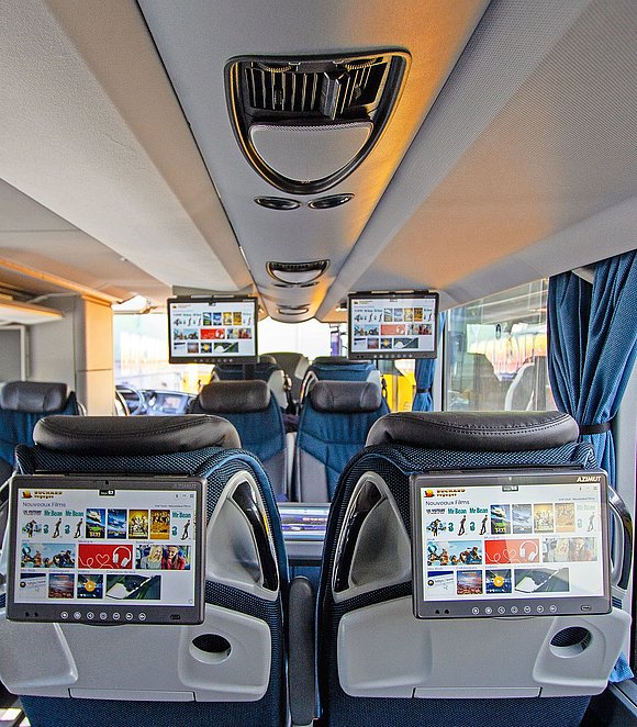 A bord, 76 places assises dans des sièges Luxline raffinés, avec une combinaison cuir-tissu haut de gamme, offrent un confort maximal aux passagers. Des appuie-tête confortables, des dossiers à retour automatique, des accoudoirs centraux, des repose-pieds ainsi que des petites tables rabattables pratiques avec rainure intégrée pour tablettes de 10 pouces et des porte-bagages en tissu complètent l’offre. Chaque siège double dispose de sa propre prise 230 volts. Le système d’info-divertissement embarqué, fourni par la société Azimut, offre à chaque passager son propre écran de 10 pouces. Une cuisine spacieuse avec deux récipients de 40 tasses, une bouilloire, un cuiseur à saucisses, une hotte aspirante, un évier, un réfrigérateur et un placard de rangement supplémentaire veille au bien-être de tous les passagers. Un éclairage périphérique bien pensé et placé sur le profil du toit offre en outre une meilleure visibilité aux passagers lors de la montée et de la descente.
