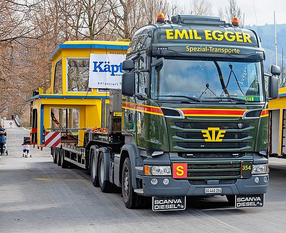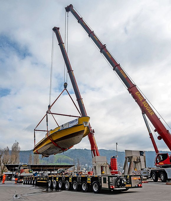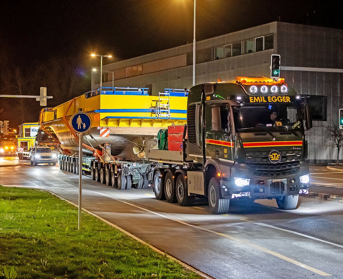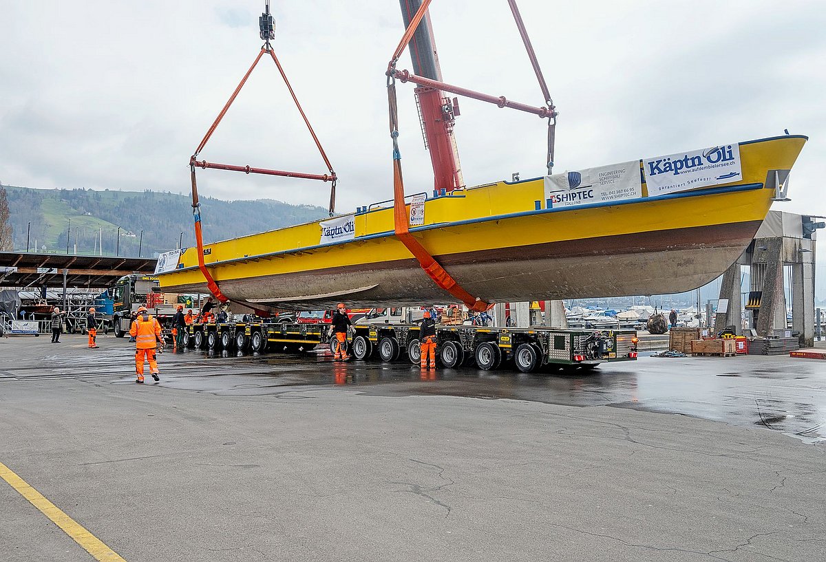 Le paquebot zougois MS Yellow, retiré du service en Suisse centrale, continuera à être exploité sur le lac de Bienne sous le nom de MS Jolie. En effet, le capitaine Olivier Perrot, connu sous le nom de «Cap’taine Oli», a acquis ce bateau jaune pour un franc symbolique et l’a fait transporter par voie terrestre vers «ses nouvelles eaux». Si ce prix d’achat d’un franc symbolique s’est transformé en une dépense finale d’un million de francs, c’est parce que le bateau a dû être démonté puis remonté pour le transport, effectué par l’entreprise Emil Egger SA. Il a d’abord été mis à nu, puis la timonerie a été séparée de la coque. Le transport nocturne s’est déroulé du port de Zoug à l’autoroute, puis à Sugiez, via Berne, jusqu’au canal de la Broye. Le convoi était composé de trois camions. A Zoug et à Sugiez, de grandes grues ont été nécessaires pour hisser la cargaison hors de l’eau et la replacer ensuite dans son élément. Un paquebot sur la route, ça nous l’avions déjà vu l’année dernière, lorsque le transport du MS Schwyz du lac de Zoug au lac de Walenstadt.