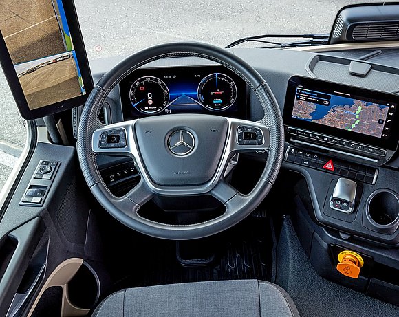 Beide Fahrerhäuser sind jedoch mit dem Spiegelkamerasystem MirrorCam ausgestattet und verfügen über das neueste digitale Cockpit. Mit dem «Multimedia Cockpit Interactive 2» ist der Truck noch vernetzter, aber auch noch intuitiver bedien- und konfigurierbar. Das System lässt sich per Sprachsteuerung, Touchscreen und Multifunktionslenkrad bedienen. Eine neue, unscheinbare Schiene unterhalb des Touchscreens ermöglicht es, die Hand für die zielsichere Bedienung abzustützen – sehr praktisch.