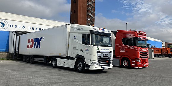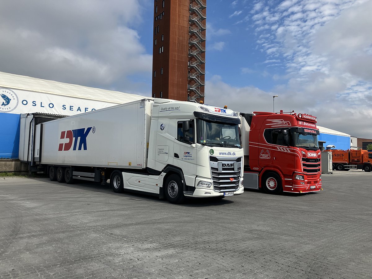 Dann ging es los zur ersten Tour. Trailer ansatteln und zum Laden nach Kliplev. Die Ladung bestand aus Stückgut für den Raum Oslo. Darunter 7,5 Lademeter ADR-Güter. Plan war mit der Fähre von Hirtshals nach Larvik zu fahren. Doch bereits nach einer Stunde Fahrzeit wurde ich umdirigiert, weil das Gefahrgut nicht mit der Fähre kompatibel war. So gab es eine tolle Tour via Kolding, Kopenhagen, Malmö nach Göteborg, wo der erste Tag endete. Der nächste Tag führte erstmal zum Zollamt Svinesund. Nach kurzem Aufenthalt ging es nach Droback zum ersten Kunden. Das entladen lief reibungslos. Dann weiter nach Oslo. Hier wurde das Nervenkostüm strapaziert. Es dauerte definitiv zu lange. Dadurch konnten die letzten beiden Kunden nicht mehr beliefert werden. Der nächste Morgen lief dafür um so runder. Bereits um 8.30 Uhr war der Auflieger leer. Die Dispo hat mir am Vortag bereits via Whats App den Tag schmackhaft gemacht. Auflieger zu einem Kunden in Gardermoen an die Rampe, anschliessend einen anderen Trailer nehmen und bei Oslo Seafood Center Lachs laden für Grimsby. Trailer via Svinesund nach Göteborg in den Hafen bringen, wo er mit DFDS nach England weitergeht. Wie reibungslos es ablaufen kann beweist die Tatsache, dass der Trailer direkt nach dem absatteln von der Hofkatze aufs Schiff gebracht wurde.