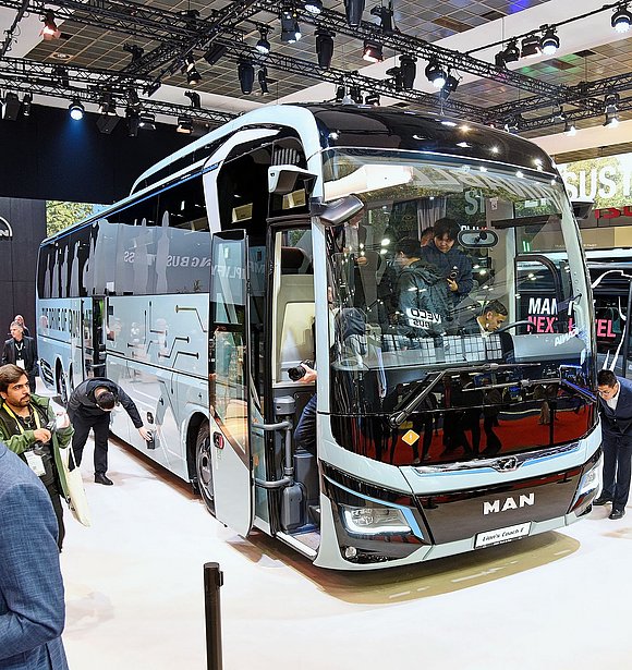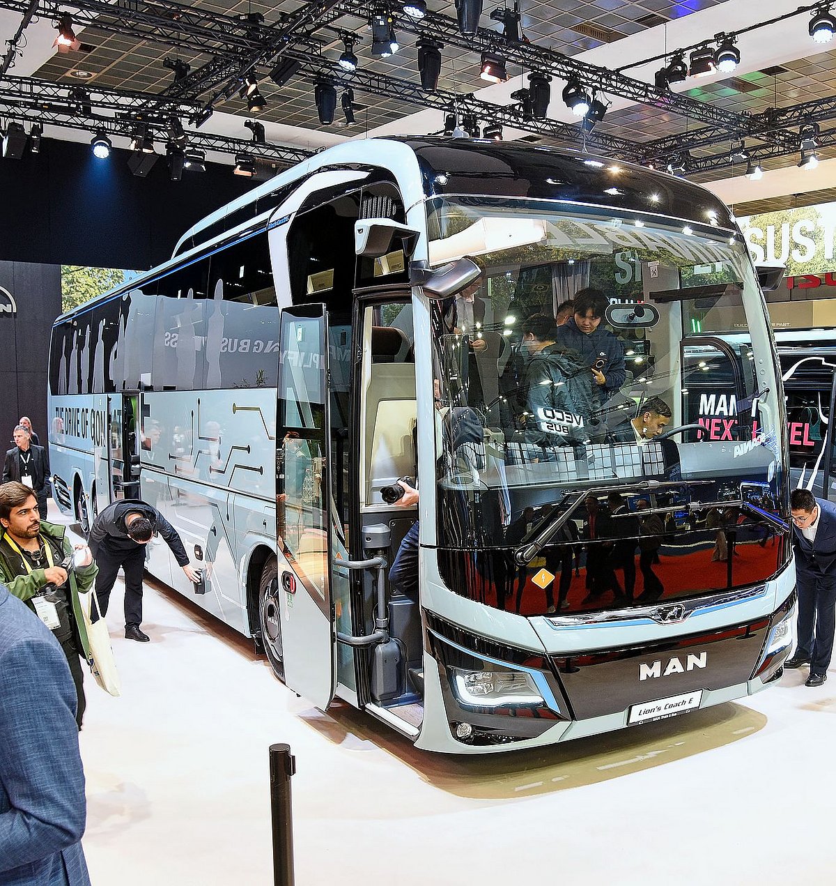 Mit der Weltpremiere des Lion’s Coach 14 Electric präsentiert MAN als erster europäischer Hersteller einen batterieelektrischen Reisebus. Der Dreiachser verfügt über vier bis sechs NMC-Batteriepakete (Kapazität 320 bis 480 kWh), welche für bis zu 650 km Reichweite gut sind. Dabei bleibt der Gepäckraum praktisch unangetastet, was im Reisebus-Segment von besonderer Bedeutung ist. Serienstart ist im kommenden Jahr, weitere Versionen sind in Planung.