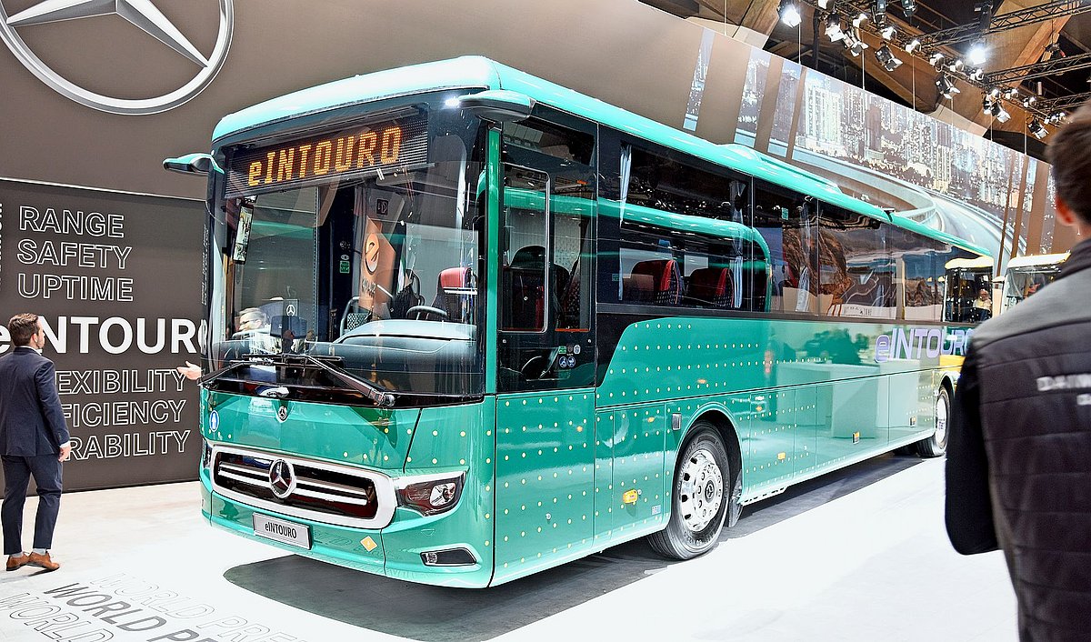 Wie MAN hat sich auch Mercedes-Benz bekannterweise eine hohe Kompetenz für elektrische Stadtbusse erarbeitet. Nun erweitert Mercedes sein E-Portfolio im Überland-Sektor und bringt den eIntouro auf den Markt. Während Mercedes in den Stadtbussen Batterien mit NMC-Zelltechnologie einbaut – eine neue NMC4-Batteriengeneration erlebte auf der Busworld ebenfalls Premiere –, werden beim eIntouro diverse Komponenten aus dem Überland-Lkw eActros 600 eingebaut (Seite 20). Kern der Technologieübernahme sind das 800-V-System und die Li-Ion-Batterie mit LFP-Zellen. 207 bis 414 kWh Kapazität ermöglichen bis zu 500 km Reichweite. Statt der E-Achse des Lkws, die ungeeignet ist für den Reisebuseinsatz, nutzt der eIntouro einen Zentralantrieb.