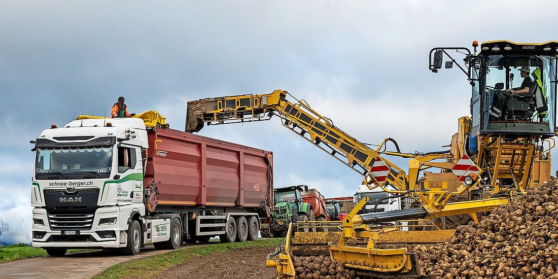 In der ländlichen Schweiz sind sie ein bekannter Anblick. Vom Herbst bis in den Winter hinein erheben sich entlang frisch brachliegender Äcker Hunderte von meist länglichen Hügeln aus Zuckerrüben. Abgetragen werden sie von Mäusen – so werden die ausgeklügelten Maschinen genannt, mit denen die Rüben vom Hügel in Traktoren- und Lastwagenanhänger gelangen. In dieser Zuckerrübensaison sind deshalb unzählige Gespanne, beladen mit Zuckerrüben, unterwegs. Sei es vom Feld zum nächsten Bahnhof oder direkt in die Zuckerfabriken von Aarberg oder Frauenfeld. In einem dieser Fahrzeuge sitzt Vanja von Allmen. Sie arbeitet als Chauffeuse und Lohnerin für das Lohnunternehmen Schneeberger & Berger Agrar-Service in Oberbottigen (BE). An der MAN TGX Zugmaschine ist ein Krampe Bandit Rollbandwagen angesattelt.