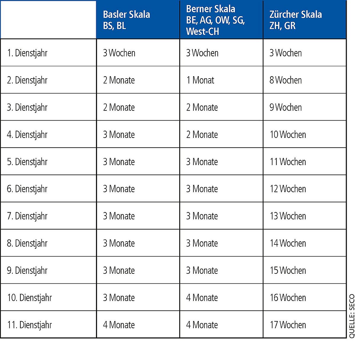 In der Schweiz ist es nicht obligatorisch, eine Lohnausfallversicherung für Krankheit abzuschliessen. Wenn der Arbeitgeber keine solche Versicherung abgeschlossen hat, ist er verpflichtet, den Lohn zu 100 % zu bezahlen, je nach Dauer des Arbeitsvertrags. Diese Dauer wird nach drei verschiedenen Skalen je nach Kanton berechnet. Die am häufigsten verwendete Skala ist die Berner Skala, die in der Westschweiz sowie in den Kantonen Bern, Aargau, Obwalden und St. Gallen als Referenz dient. Es gibt aber auch die Basler und die Zürcher Skala.