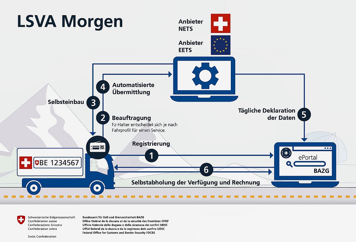 Der europäische elektronische Mautdienst EETS ist seit Anfang 2021 in der Schweiz verfügbar. Dieser Erfassungsservice entspricht bereits dem neuen Systemkonzept. EETS soll zum Haupterfassungsdienst für die ausländischen Fahrzeuge werden und ersetzt schrittweise das heutige manuelle System mit den Abfertigungsterminals an der Grenze. Künftig sollen auch inländische Fahrzeuge EETS nutzen können. Auch EETS-Provider müssen ein Zulassungsverfahren durchlaufen, bevor sie ihren Service für die LSVA anbieten können.