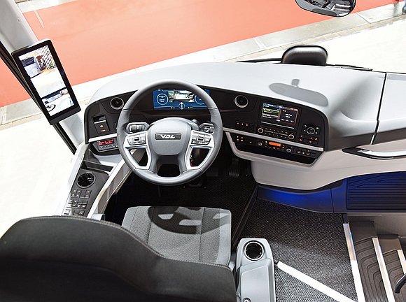 Das gute Zusammenspiel von Mensch und Maschine ist das A und O des sogenannten Human Machine Interface HMI. Griffgünstig platzierte Tasten und Schalter, saubere Darstellung und unverwechselbare Symbole und Warnelemente sind denn auch wichtige Bestandteile des neuen Cockpits im Futura 3. Dazu kommt ein komplett neues Lenksystem, welches grössere Lenkrad-Verstellmöglichkeiten bietet. Und wer das DAF-Lkw-Lenkrad kennt, wird die gute Tasten-Ergonomie auch im VDL zu schätzen wissen.