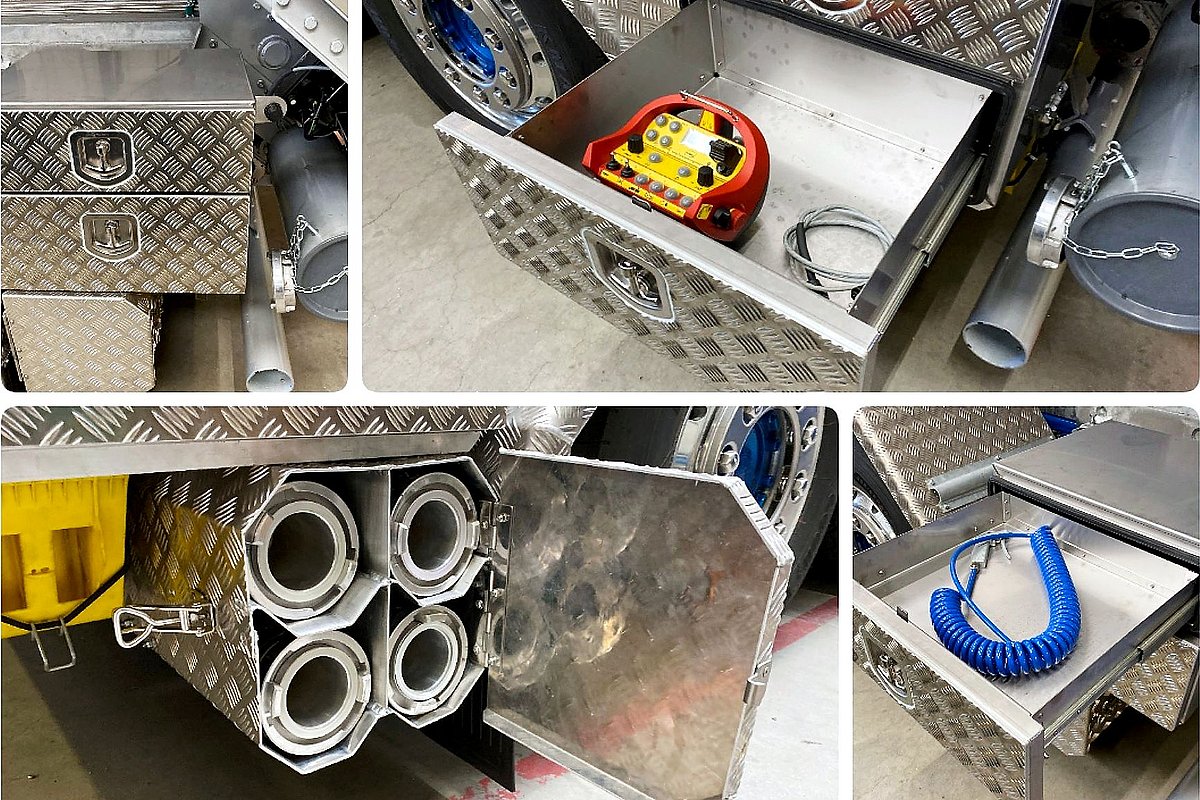 Besonderes Augenmerk wurde auf den Entladevorgang gelegt: Anstelle eines herkömmlichen Gebläses kommt ein gekühltes Kompressor-Aggregat zum Einsatz, das selbst bei langen Schlauchleitungen zuverlässig arbeitet. Für Sicherheit bei Wartungsarbeiten sorgt ein pneumatisch aufstellbares Sicherheitsgeländer, das sich bequem vom Boden aus bedienen lässt. Zusätzlich minimiert eine Anti-Rutsch-Beschichtung auf dem Fahrzeugdach das Unfallrisiko. Die Integration von sechs verschiebbaren Trennwänden im Innenraum ermöglicht eine flexible Ladungsaufteilung. Die Aussenführung der Schienen samt Hebevorrichtung erlaubt eine einfache Handhabung, während 13 Verriegelungspositionen für maximale Anpassungsfähigkeit sorgen. Auch bei der Ausstattung mit Werkzeugkisten wurden keine Kompromisse gemacht. In enger Abstimmung mit dem Kunden wurden diese exakt nach Wunsch platziert – inklusive Riffelblechverkleidung als Designelement. Der modulare Aufbau sorgt dafür, dass Werkzeuge und Zubehör jederzeit griffbereit und ordentlich verstaut sind. «Projekte wie dieses zeigen, dass individueller Fahrzeugbau nach wie vor gefragt ist – und das aus gutem Grund», sagt Michael Späti, Geschäftsführer der Calag Carrosserie Langenthal AG. Die Zusammenarbeit mit Rüegsegger habe nicht nur technisch überzeugt, sondern auch den hohen Stellenwert echter Handwerkskunst deutlich gemacht.