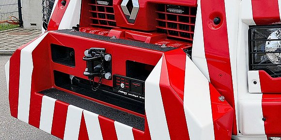 Der Renault Trucks K520 ist mit allen Sicherheitsmerkmalen ausgestattet, die auf vielen seiner oftmals belebten Einsatzorte von elementarer Bedeutung sind. Das beginnt bei den Beleuchtungselementen ebenso wie bei den Mitteln zur Rundumsicht. Beim Aufbau aus dem Hause EMPL Fahrzeugwerk GmbH, dem EH/W 200 Bison, sorgt ein Bergearm mit einer Hubkapazität von 20 Tonnen dafür, dass praktisch jedes Schwergewicht angehoben werden kann. Der hydraulische Unterlift ist extrem flach gehalten und verfügt über einen zweifachen Ausschub. Seine Neigung lässt sich von 90 bis –15 Grad verstellen. Nach aussen gezogene Bergestützen mit schwenkbaren Bodenplatten sorgen für maximalen Halt.