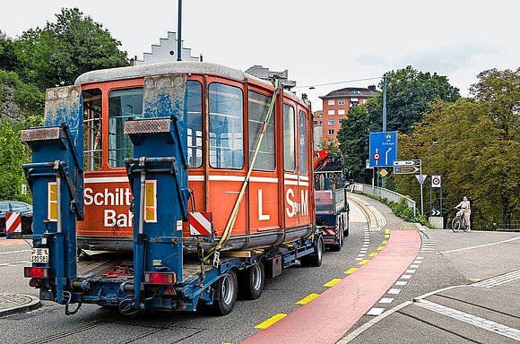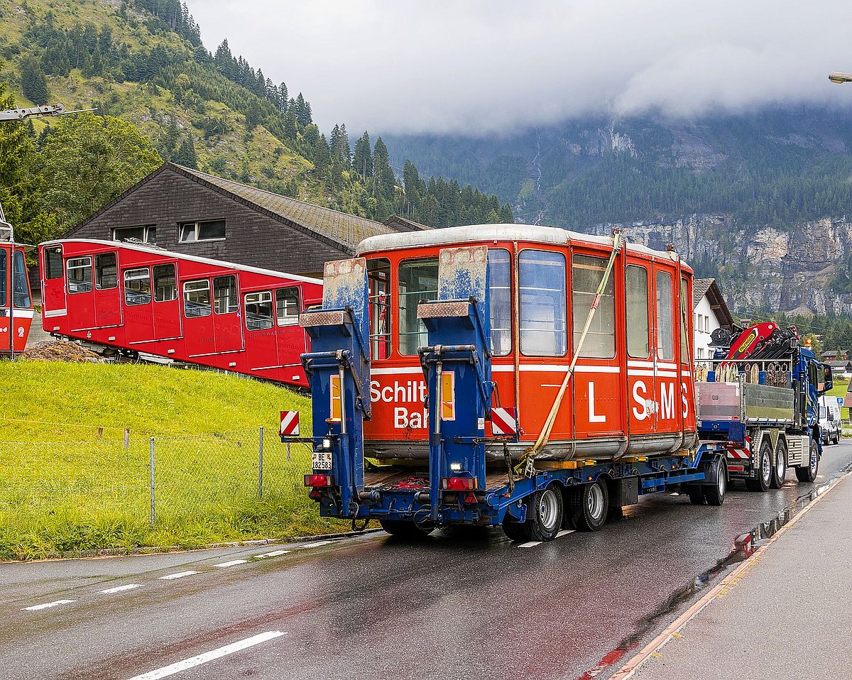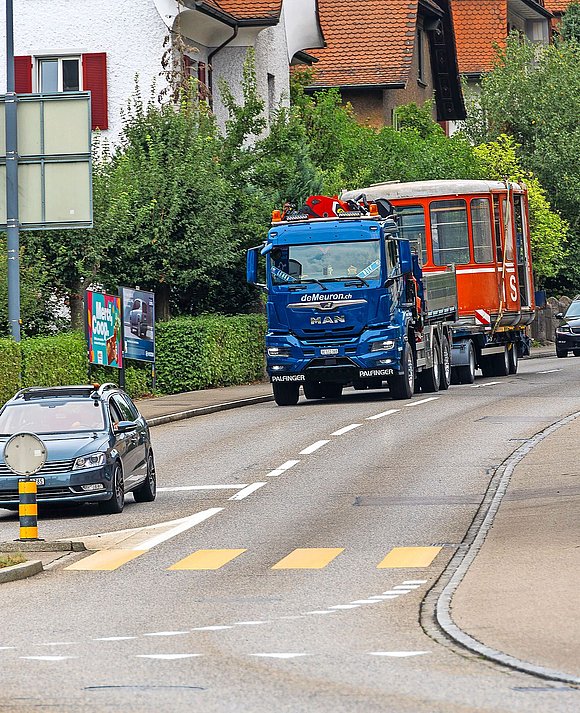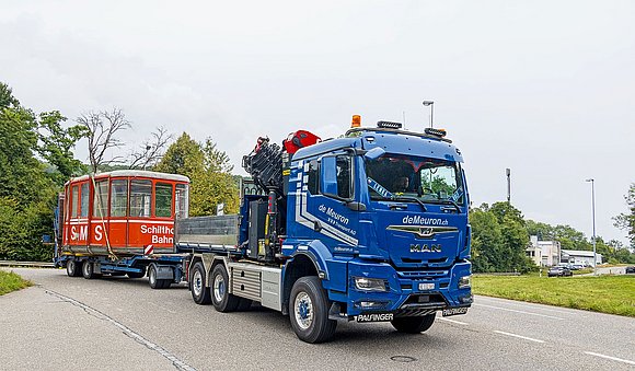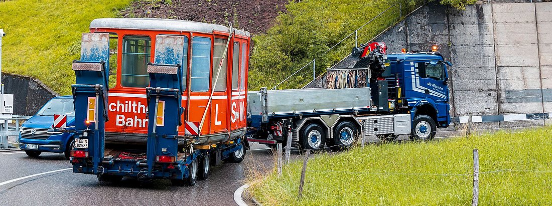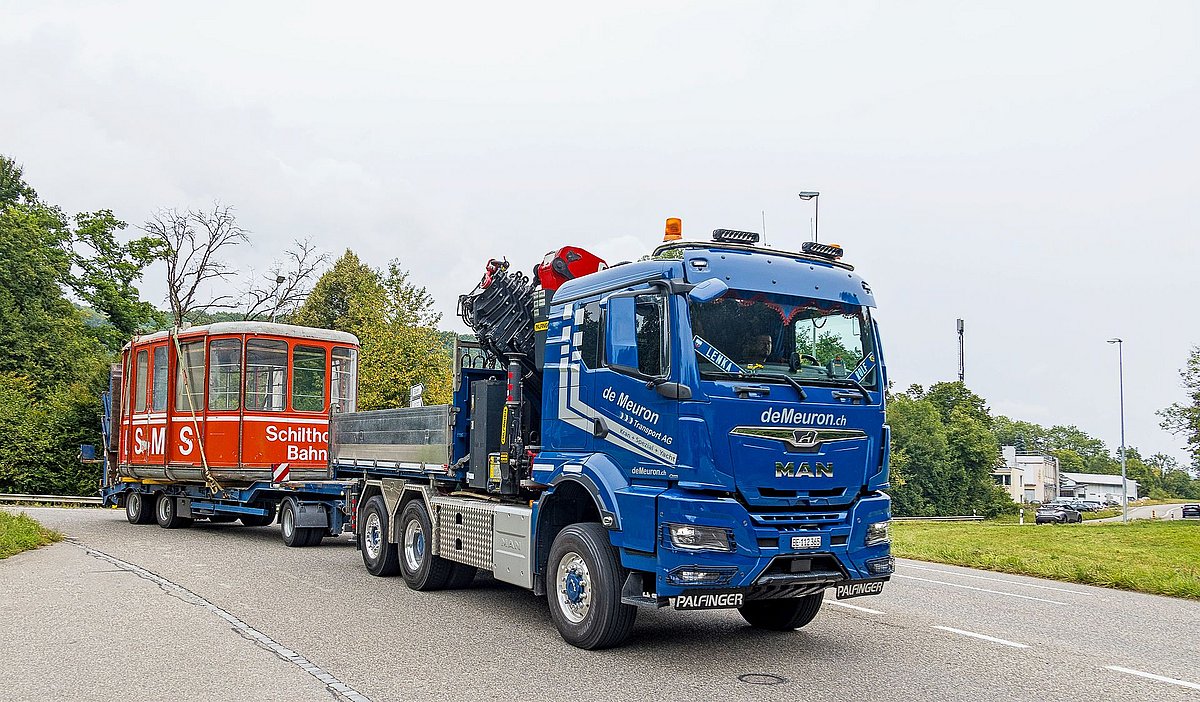 Der Transport der historischen Kabine ins Berner Oberland wurde durch die Firma de Meuron aus Gerzensee durchgeführt, die dazu einen MAN mit Tiefladeanhänger einsetzte. Insbesondere, da am Ziel rückwärts neben das Museumsgelände gefahren werden musste, war der Anhängerzug im Vorteil, da er wendiger ist. Zudem war das Zugfahrzeug gleich mit einem entsprechenden Kran ausgestattet, sodass kein zusätzliches Fahrzeug notwendig war.