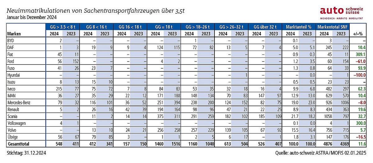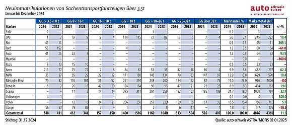Auch im Segment der leichten Nutzfahrzeuge bis 3,5 Tonnen Gesamtgewicht blieb der Markt stabil. Mit 30 529 Neuzulassungen wurde ein leichtes Plus von 0,9 Prozent im Vergleich zum Vorjahr verzeichnet. Damit spiegelt die Entwicklung in diesem Segment das allgemeine Wirtschaftswachstum der Schweiz wider. Die Mitglieder von auto-schweiz erwarten für 2025 eine weitere Steigerung von etwa fünf Prozent, was einer Prognose von 32 000 Neuzulassungen entspricht.