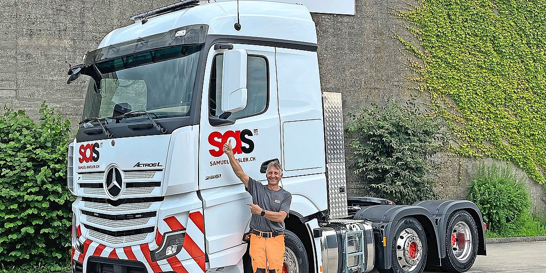 Leo Steinacher, Chauffeur bei Samuel Amsler AG, Schinznach-Dorf (AG), freut sich riesig über sein neues Fahrzeug, das er just an seinem Geburtstag übernehmen durfte. Es handelt sich um einen Mercedes-Benz Actros 2551-LS 6×2/4 mit 510 PS. LRS