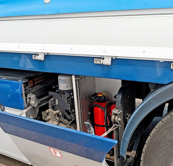 Es sind noch nicht viele E-Lastwagen mit Kran unterwegs. So ist die Reichweiten-Thematik ein grosses Thema, in Zusammenhang mit einem Kran erfordert dies umso mehr Flexibilität und KnowHow in der Disposition. Und: Die Anforderungen an den Aufbau sind ebenfalls hoch. Der Kran muss Platz haben, dazu Werkzeuge und Feuerlöscher. Doch der Platz hinter dem Unterfahrschutz ist bereits besetzt. Dort befinden sich nämlich die Batterien des E-Lastwagens mit Palettenaufbau. Dieser soll aber wie ein Kranfahrzeug funktionieren, der Stückgut transportiert und gefahrguttauglich ist. Und das tut er auch. Die F. Stuber Transporte hat dafür den Aufbau von LANZ+MARTI AG anfertigen lassen. «Die Stützen des Krans lassen sich aus Patzgründen nach oben schwenken», erklärt Mario Stuber von der Geschäftsleitung des Transportunternehmens. «Der Hilfsrahmen für den Kran hat LANZ+MARTI AG nach Rücksprache mit dem Kranhersteller produziert.» Weil sich der Hydrauliktank bei E-Lastwagen meist hinter der Kabine befindet, war es eine grosse Leistung, den Kran trotzdem zu platzieren. Die Feuerlöscher kamen auch unter, und zwar in einer Spezial-Werkzeugkiste, die auch bei Armeefahrzeugen zum Einsatz kommt. Die Anforderungen vom Kunden, dass alles Werkzeug, Ladungssicherungsmaterial und Zubehör mitgenommen werden kann, erfordert Speziallösungen, die LANZ+MARTI AG mit dem Kunden zusammen umsetzt. Wenn es beispielsweise keinen Platz für Werkzeugkisten hat, wird eine Bodenkiste integriert.