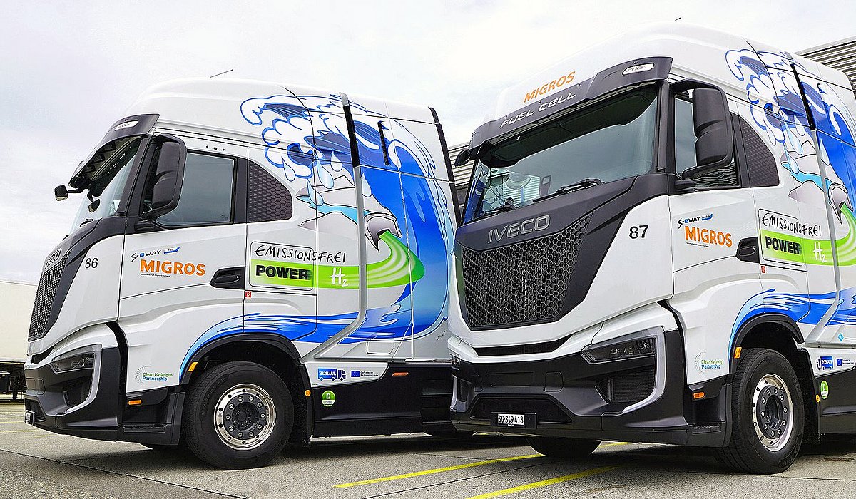 Mit Iveco ist nun ein zweiter Lastwagenhersteller bereit für den Brennstoffzelleneinsatz im Schwerverkehr. Der Iveco S-eWay Fuel Cell wird zwar noch in einer Vorserie produziert, doch werden diese Fahrzeuge über ganz Europa verstreut zum Einsatz gebracht. Beispielsweise wurden an BMW für die Werklogistik rund ums Werk Leipzig zwei Sattelschlepper ausgeliefert. Auch in der Schweiz wurden soeben vier 6×2-Sattelschlepper in den Kundeneinsatz geschickt. Zwei stehen bei G. Leclerc (Egerkingen) im Einsatz und zwei bei der Migros Ostschweiz (Gossau). Beide kennen die Brennstoffzellenthematik, da sie seit fünf Jahren bereits den Xcient Fuel Cell (siehe links) von H2-Pionier Hyundai Hydrogen Mobility HHM im Fuhrpark haben.