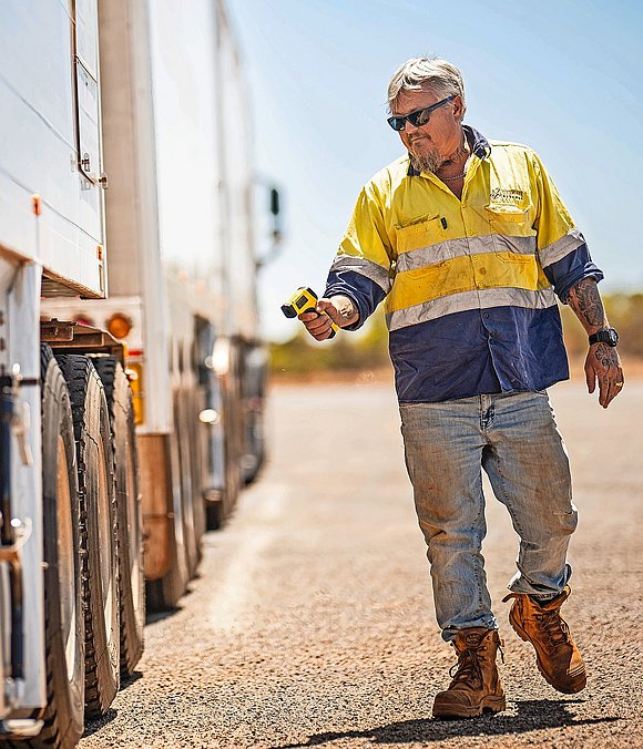 Die Zugmaschine ist ein neuer Volvo FH 16 mit XXL-Kabine und 17-Liter-Motor mit 780 PS. Den 8×4 mit dem neuen Flaggschiff-Motor setzt Volvo Trucks Australia für die Kundenerprobung ein. Doch auch mit 780 PS und 3800 Nm Drehmoment geht es nur gemächlich über die ersten Hügel nach Perth, und der rund 115 Tonnen wiegende Roadtrain zuckelt schwerstarbeitend mit 46 km/h die Steigung hoch. Ein paar Kilometer weiter wird es nochmals steiler, und es liegen dort nur noch 26 km/h drin. Doch Lewis ist zufrieden mit der Performance seines Fahrzeuges. Den ersten Kaffeehalt legt er nach den obligatorischen fünf Stunden ein. Bei jedem Halt checkt er die Räder – aktuell sind es total 58 Stück –, indem er dem Pneudruck akustisch mit einem speziellen Eisenstab und der Reifentemperatur elektronisch mit einer Infrarot-Messpistole auf den Zahn fühlt.