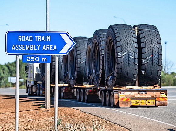 Nach drei Vierteln der Strecke erwacht wieder einmal das Funkgerät. Während das ebenfalls vorhandene Satellitentelefon die Rettungsleine für Notfälle ist, dient der Funk für die Kommunikation zwischen den Fahrern auf der Strecke. Ein Spezialtransport mit 8,5 Metern breiter Ladung kommt entgegen und belegt beide Spuren der Landstrasse. Lewis fährt vorsichtig auf den Seitenstreifen. Eine Stunde später koordiniert er sich am Funk mit dem vor ihm fahrenden, mit Riesenreifen beladenen Roadtrain, um diesen zu überholen. «Solche Manöver verlangsamen die Fahrt und brauchen eine Menge Treibstoff», erklärt Lewis. «Aber wir verstehen uns hier draussen gut und helfen einander weiter.»