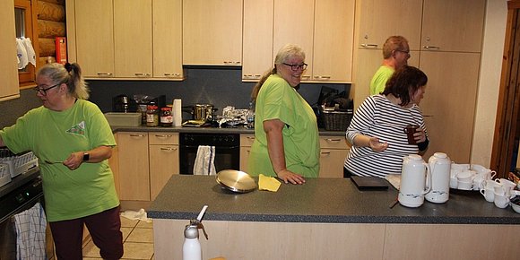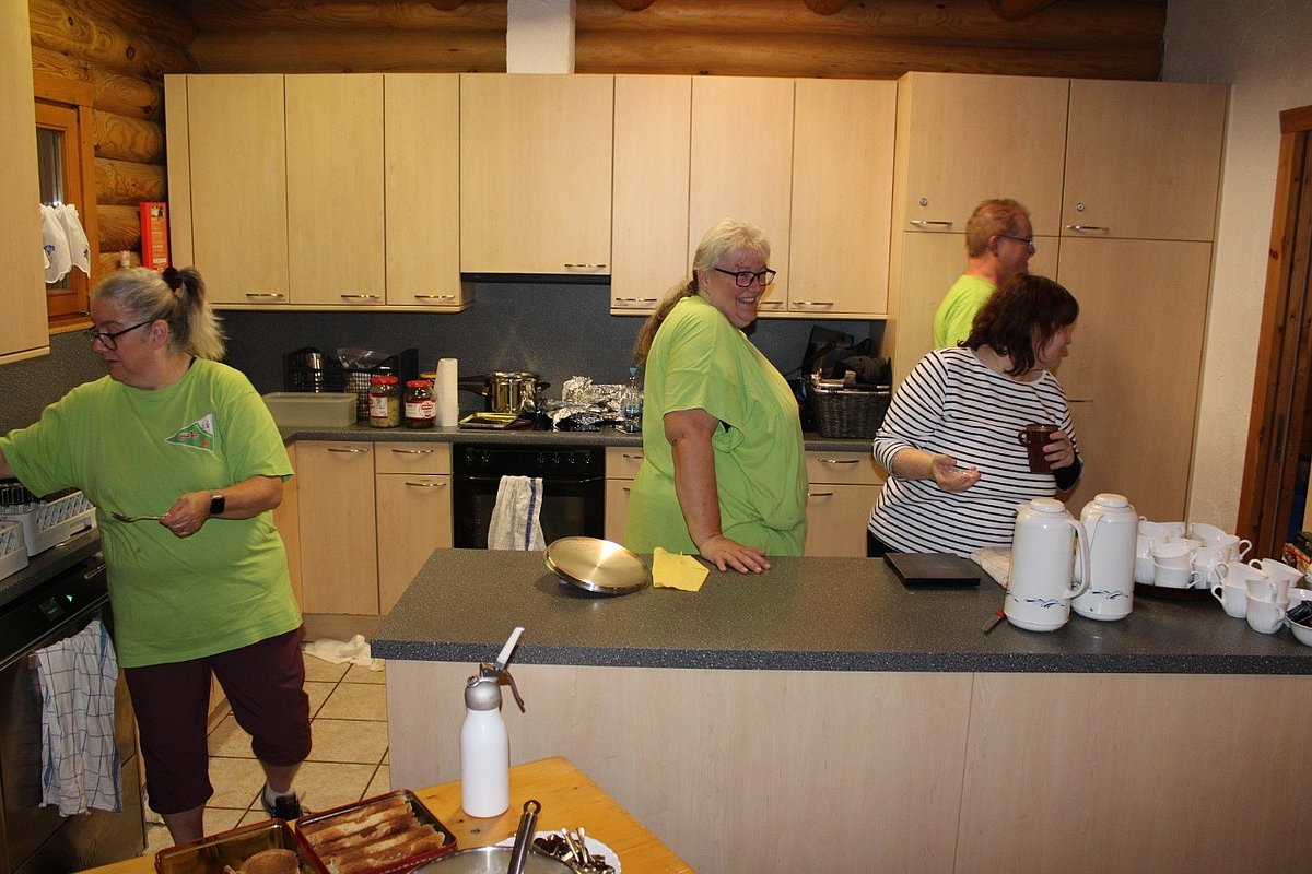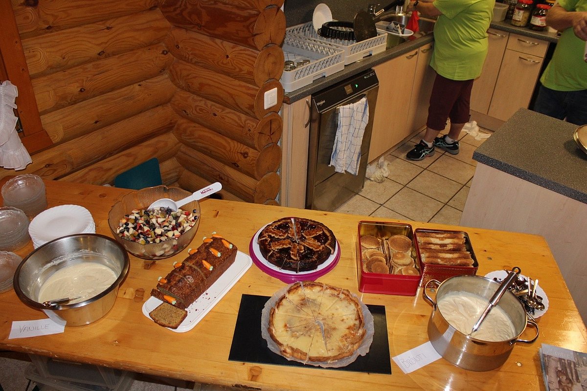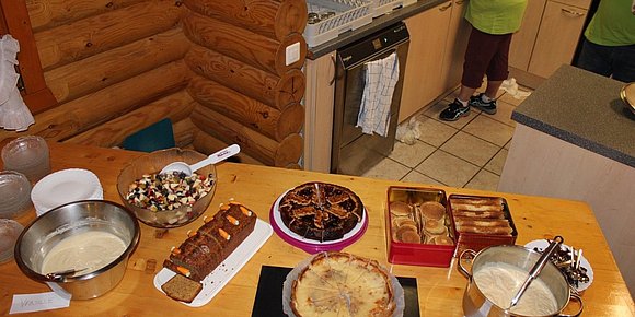 Die Gäste hatten sehr eifrige Gespräche und konnten sich rege Austauschen. Als alle satt waren und wir die Küche wieder auf Vordermann gebracht hatten, richteten wir das Dessertbuffet mit zwei Sorten Cremen, frischer Fruchtsalat, Rüeblicake, Nidlechuche, Linzertorte, Brätzeli ein. Den fleissigen Bäckern und Köchen besten Dank für die wunderbaren Desserts. Unsere zwei Kaffeemaschinen kamen nun auch zum Einsatz. Nach dem alle Gäste gegangen waren, kam noch das Aufräumen, welches relativ zügig von Hand ging, da die Crew doch schon sehr gut eingespielt war von vergangenen Anlässen. So konnte um 24:00 Uhr der Schlüssel vom Waldhaus gedreht werden, welches für das nächste Raclette Essen bereits wieder reserviert ist.