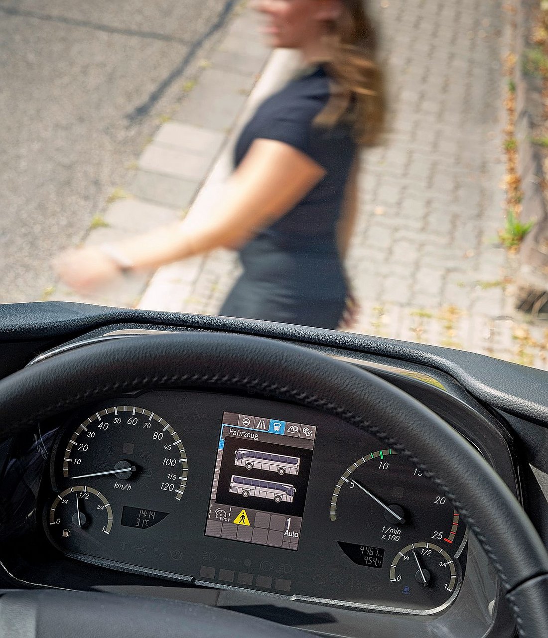 Die meisten der durch die GSR-B neu vorgeschriebenen Sicherheitssysteme sollen den Chauffeur und die Chauffeuse in der Komplexität des Stadtverkehrs unterstützen. Unter anderem wird ein Abbiegeassistent vorgeschrieben, der vor Fussgängern oder Velofahrern auf Türseite warnt. Mercedes-Benz hat seinen Sideguard Assist bereits seit sieben Jahren im Einsatz, hat ihn nun verfeinert und auch auf die Fahrerseite ausgeweitet, sodass man am Steuer beim beidseitigen Abbiegen vor Personen im kritischen Sektor des Busses gewarnt wird.
